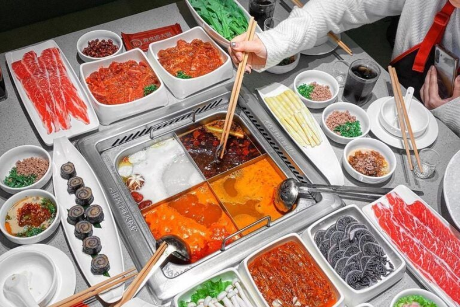 Thực đơn tại Haidilao là sự kết hợp đa dạng giữa các loại nước lẩu đặc trưng. Bạn có thể thưởng thức lẩu Tứ Xuyên cay nồng với hương vị tê tê đặc trưng của hoa tiêu, hay lẩu thảo dược bổ dưỡng tốt cho sức khỏe, lẩu nấm thanh đạm, thậm chí là lẩu cà chua chua ngọt. Đi kèm là thực phẩm chất lượng cao như thịt bò Mỹ cắt lát mỏng, hải sản tươi sống, há cảo nhân đầy đặn và rau củ phong phú. Đặc biệt, quầy sốt chấm của Haidilao là điểm nhấn khó quên, khi bạn có thể tự mix hàng chục loại sốt khác nhau, tạo nên hương vị riêng biệt cho nồi lẩu.