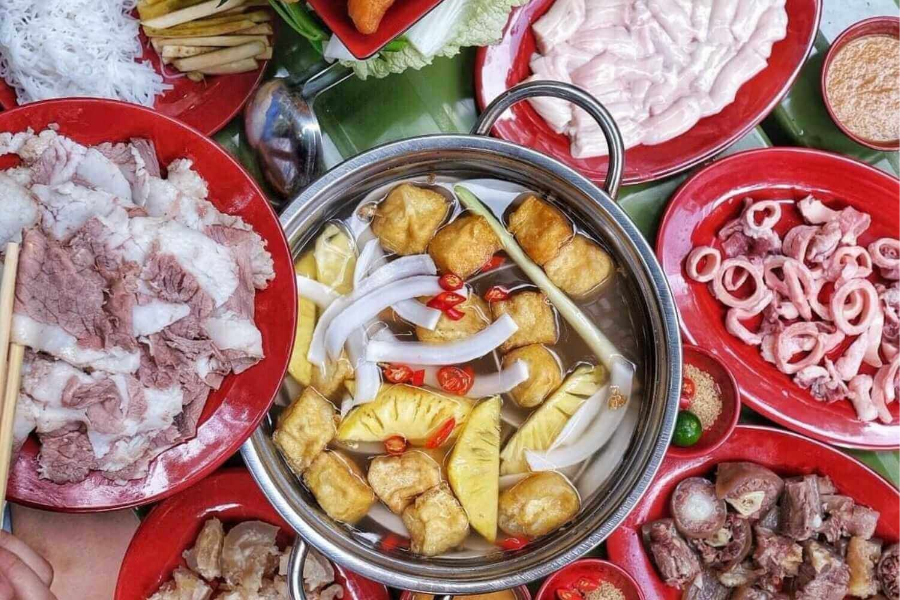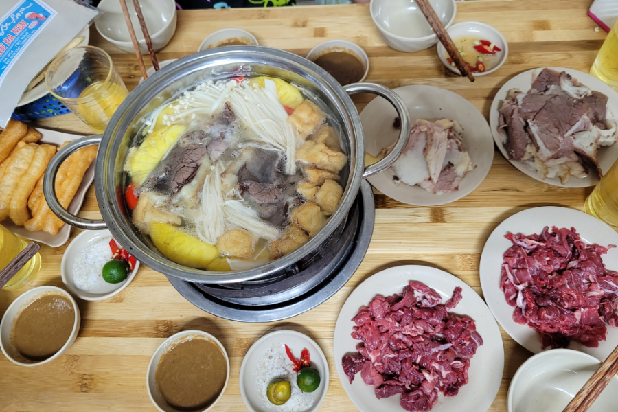 Bò Nhúng Dấm A Hói là một địa điểm bình dân khác được nhiều người yêu thích, nổi bật với sự tươi ngon của thịt bò và thái độ phục vụ nhanh nhẹn. Quán có không gian đơn giản, gần gũi, tập trung vào trải nghiệm ăn uống chất lượng. Món best seller là Bò Nhúng Dấm với phần thịt bò tươi rói, đảm bảo độ mềm khi nhúng lẩu. Đây là lựa chọn lý tưởng cho những bữa ăn nhanh, không cầu kỳ. Khoảng giá tham khảo bình dân, từ 110.000 VNĐ – 190.000 VNĐ/người.