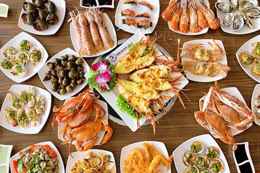 Buffet Dragon Sea có không gian rộng rãi, trang trí lịch sự, đơn giản nhưng không kém phần ấm cúng, phù hợp cho các bữa ăn gia đình. Thực đơn chủ yếu là Hải sản tươi ngon được nhập mới hàng ngày, chế biến đa dạng từ nướng, hấp, đến các món nóng Á. Món Tu hài nướng mỡ hành và Ốc hương xào me được đánh giá rất cao về độ tươi. Khoảng giá tham khảo tại đây là khoảng 350.000 VNĐ – 550.000 VNĐ/người, một lựa chọn chất lượng cho những ai yêu thích hải sản.