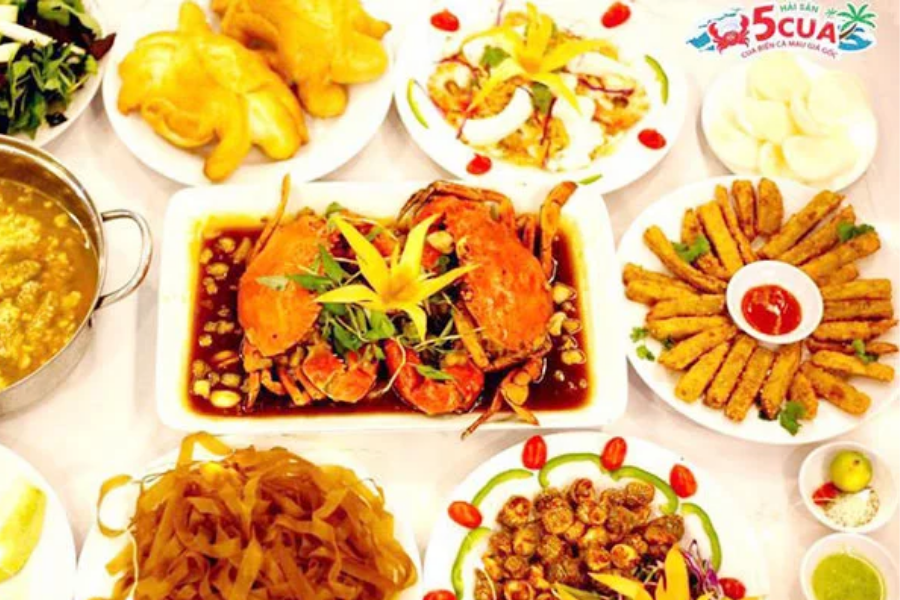 5 Cua là nhà hàng chuyên về Hải sản với điểm nhấn là các món ăn từ Cua. Nhà hàng có không gian bình dị, ấm cúng, phù hợp cho những người yêu thích món cua và hải sản tươi ngon. Món best seller là các món chế biến từ Cua tươi (Cua rang me, Cua sốt ớt Singapore, Lẩu Cua), cùng các món hải sản khác như Ốc, Tôm. 5 Cua mang đến hương vị hải sản đậm đà, giá cả phải chăng. Khoảng giá tham khảo tầm trung, từ 250.000 VNĐ – 450.000 VNĐ/người.