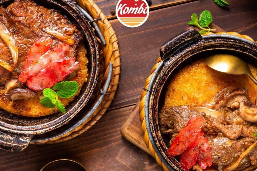 Cơm Niêu Singapore nóng hổi, có lớp cháy giòn rụm, được yêu thích tại Kombo.