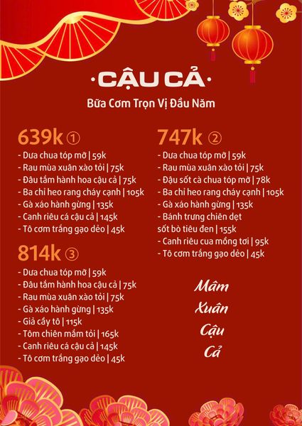 Nhà hàng Cậu Cả tự hào mang đến một thực đơn phong phú, đa dạng, là sự kết hợp tinh hoa giữa hải sản tươi sống chất lượng cao và các món đặc sản độc đáo, cùng nhiều món ăn sáng tạo, hấp dẫn. Mọi nguyên liệu đều được tuyển chọn kỹ lưỡng, đảm bảo độ tươi ngon và hương vị chuẩn mực. Quán còn có những món ăn làm nên thương hiệu như Mực xông hơi cuốn bánh tráng – món ăn độc đáo với mực tươi ngọt, giữ nguyên độ giòn sần sật, cuốn cùng rau sống và bánh tráng, chấm nước chấm đặc trưng. Hàu nướng thố mang đến sự lựa chọn đa dạng cho tín đồ hàu. Ngoài hải sản, các món ăn "nhậu" và món ăn gia đình cũng vô cùng hấp dẫn: Khoai lắc phô mai giòn rụm, béo ngậy; Đuôi heo tươi sốc mắm tỏi đậm đà, giòn sần sật; Lẩu vịt om sấu nước dừa với hương vị chua thanh, béo ngậy, thịt vịt mềm thơm; và món Cơm chiên hoàng bào cầu kỳ, đẹp mắt, hương vị thơm ngon, hứa hẹn một bữa tiệc vị giác bùng nổ.