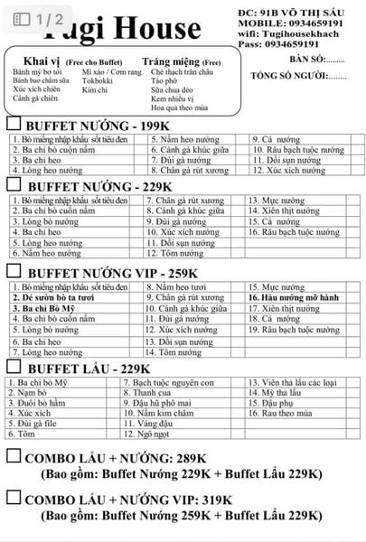 Đến với Tugi House, thực khách chắc hẳn sẽ không khỏi choáng ngợp trước buffet lẩu nướng đa dạng hơn 50 món nướng, khiến bạn trải nghiệm "mukbang" bữa tiệc lẩu nướng như phim Hàn, có thể kể đến như Bò tảng nguyên vị, Bò tảng sốt tiêu đen, Nầm heo nướng, Sườn heo sốt BBQ, Bạch tuộc nướng nguyên con,... Sau chầu nướng no nê, nhà hàng còn có vô vàn lựa chọn buffet lẩu không kém phần hấp dẫn như Lẩu Thái Tomyum, Lẩu Tứ Xuyên, Lẩu cà chua,... đảm bảo ăn một lần là nhớ mãi. Đặc biệt, với những bữa tiệc nướng cộp mác xứ củ sâm, những món ăn kèm panchan là không thể thiếu, khiến hương vị món nướng trở nên lôi cuốn hơn bao giờ hết. Vị ngọt thơm béo đặc trưng của thịt nướng xì xèo trên bếp than, hòa quyện với chút giòn giòn của rau sống, chua dịu nhẹ của củ cải muối, chút cay tê của nước sốt, quả thật là một sự kết hợp ẩm thực tuyệt hảo.