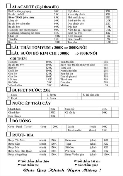 * Món ăn đặc sắc: Bò tảng nguyên vị , Bò tảng sốt tiêu đen, Nầm heo nướng, Sườn heo sốt BBQ, Bạch tuộc nướng nguyên con, Lẩu Thái Tomyum, Lẩu Tứ Xuyên, Lẩu cà chua,...