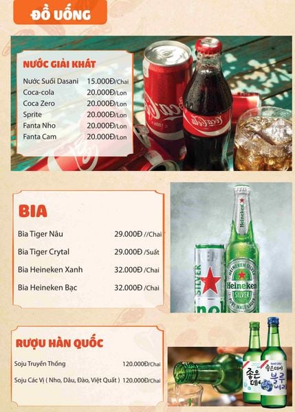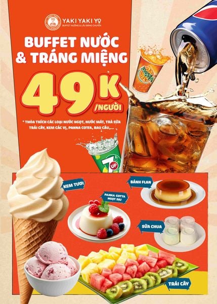 - Buffet nước & tráng miệng 49K/người ( Bao gồm các loại nước ngọt, nước mát, kem, trái cây và Chè )