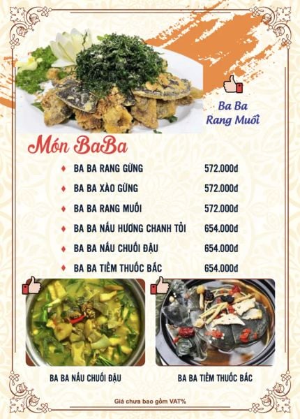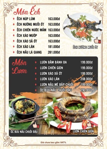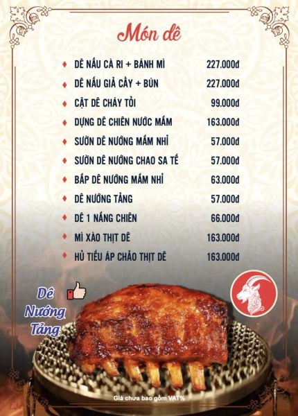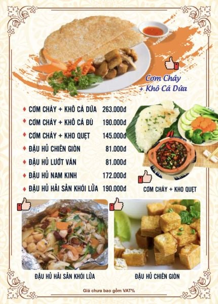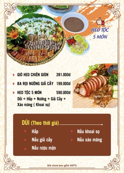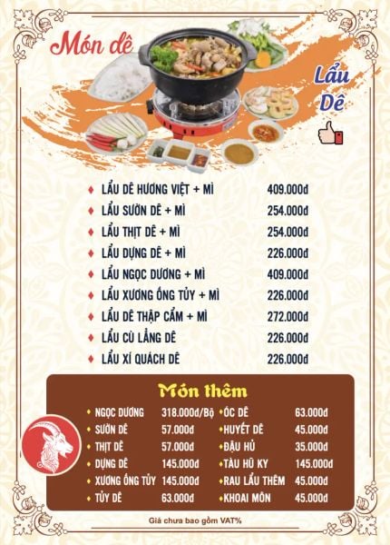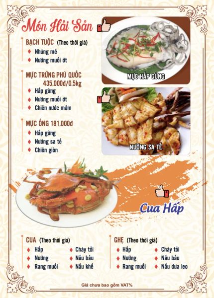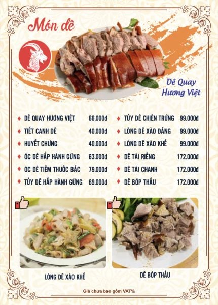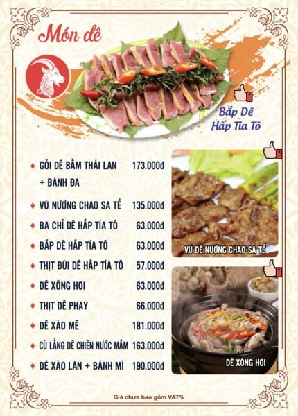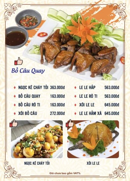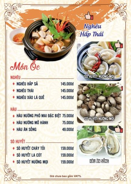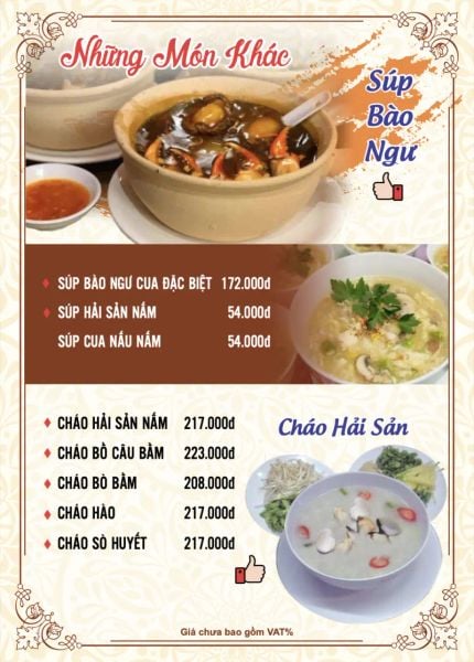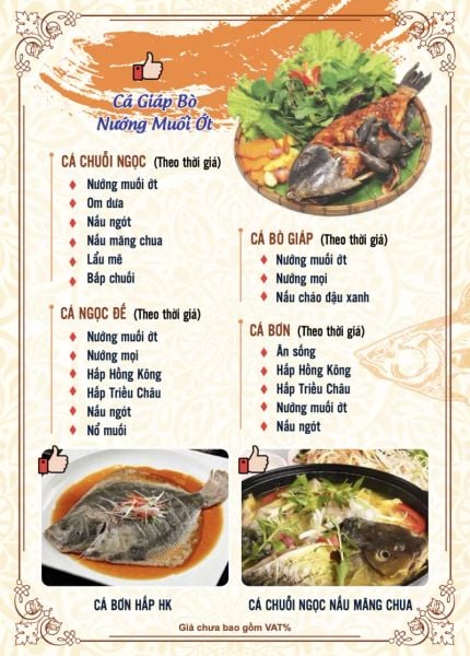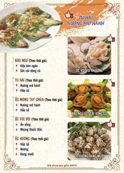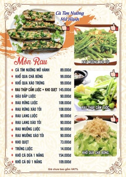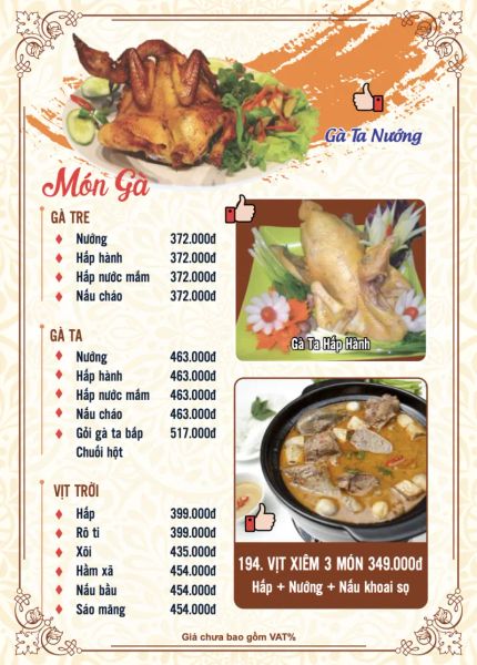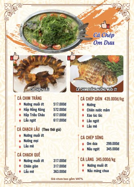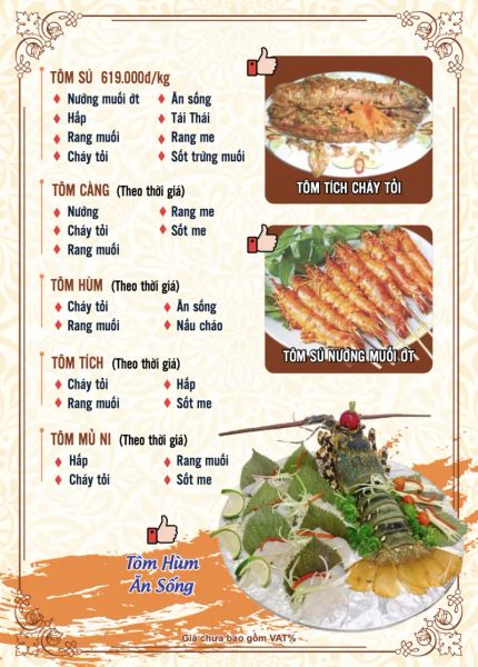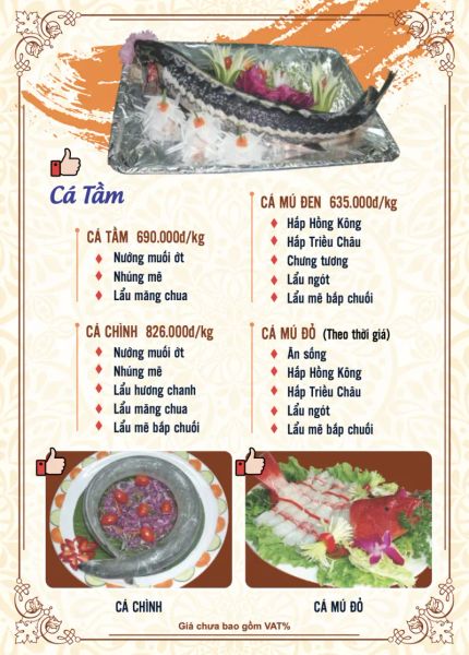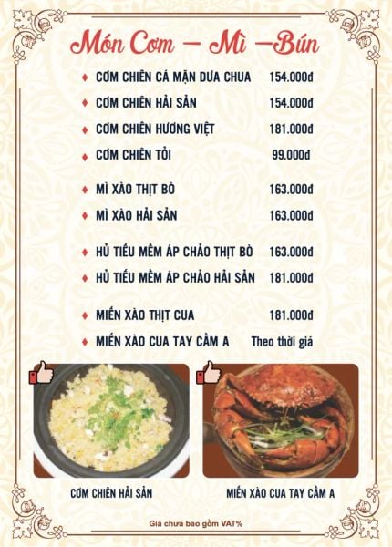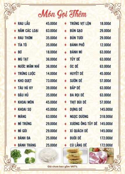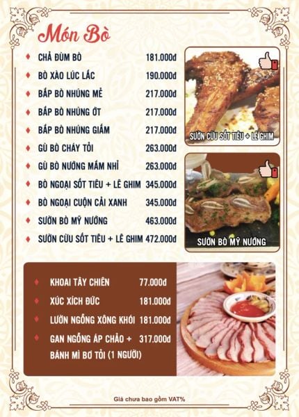 - Menu chưa bao gồm VAT, Nhà hàng luôn thu hộ thuế VAT. Mức phí VAT là theo quy định.