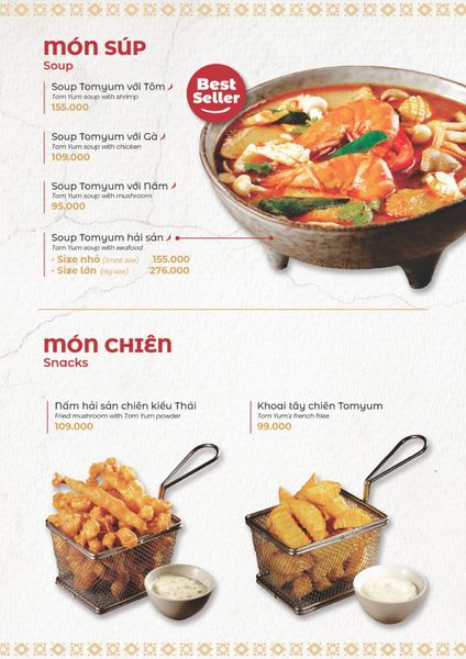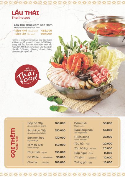 Bếp Thái Koh Yam chuyên phục vụ buffet lẩu Thái và nhiều món ăn Thái Lan đa dạng. Một số món đặc trưng được nhiều thực khách yêu thích tại đây bao gồm Lẩu Thái & súp Tom Yum, Gà lạnh tắm sốt thảo dược, Gỏi xoài xanh cá trê xay, Nấm hải sản chiên kiểu Thái, Heo dầm nướng tảng chấm sốt Namchimchao, Mực nướng sốt Thái, Xôi xoài Thái… Mỗi món ăn là sự kết hợp hoàn hảo giữa gia vị và nguyên liệu tươi ngon, mang đến trải nghiệm vị giác khó quên cho thực khách.