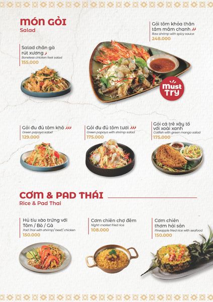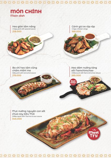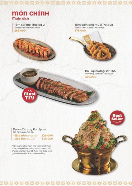 * Món đặc sắc: Lẩu Thái và súp Tom Yum, gà lạnh tắm sốt thảo dược, gỏi xoài xanh cá trê xây tổ, gỏi tôm khỏa thân tắm mắm chanh, nấm hải sản chiên kiểu Thái, heo dằm nướng tảng chấm sốt Namchimchao, mực nướng tảng sốt Thái, bò Fuji kiểu Thái, kem dừa Koh Samui, và xôi xoài Thái.