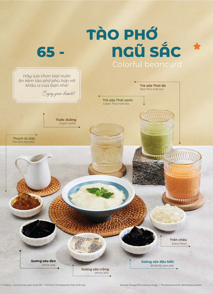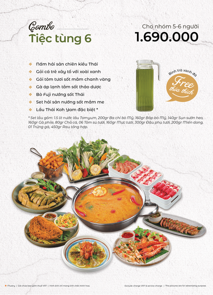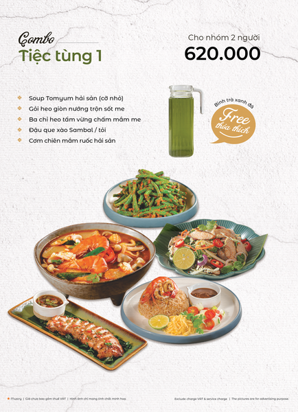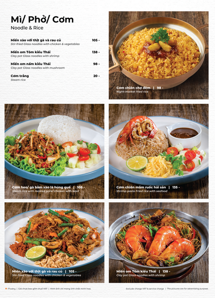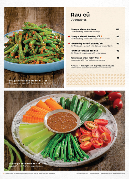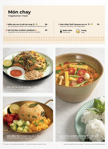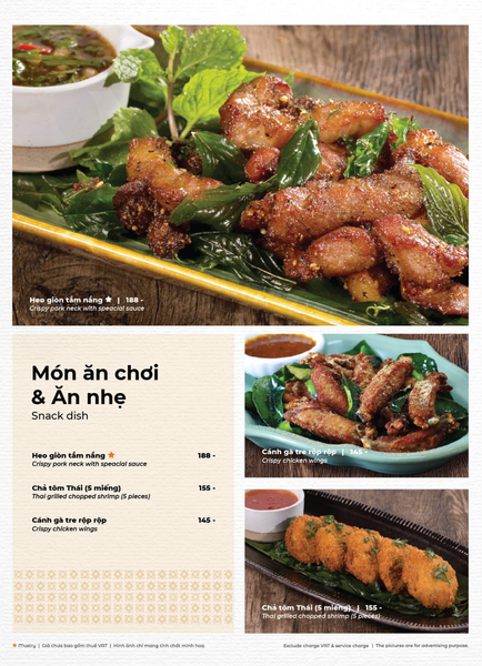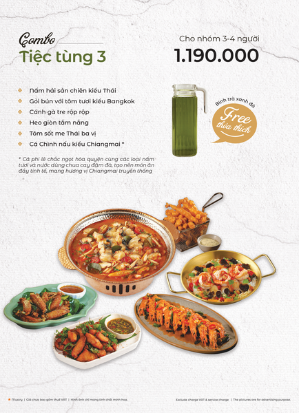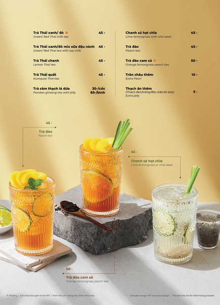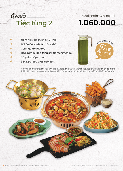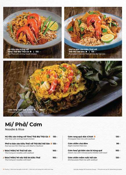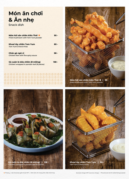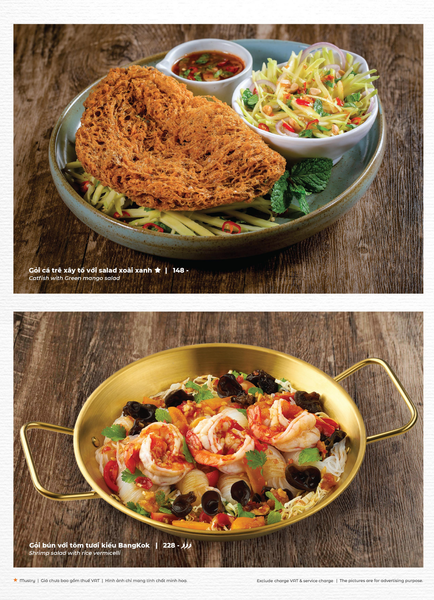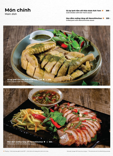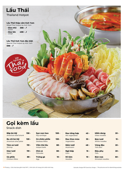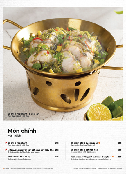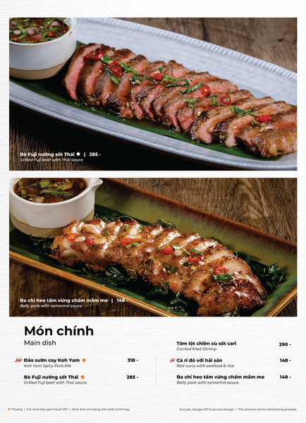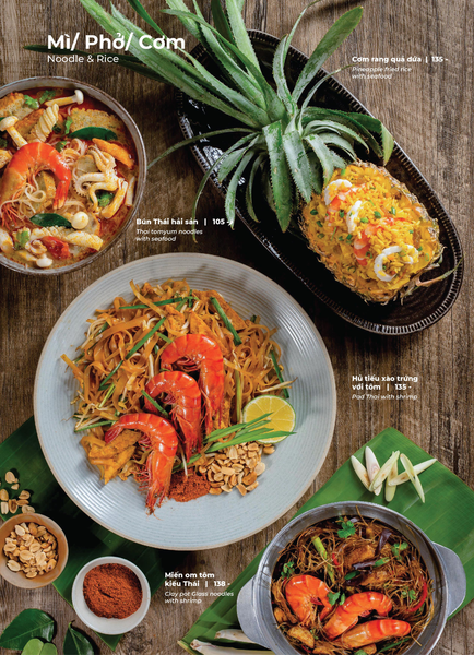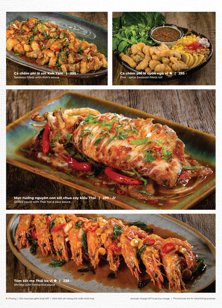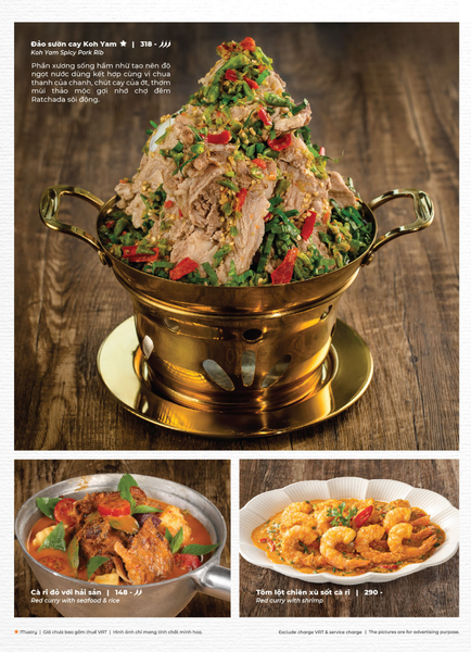 * Món đặc sắc: Lẩu Thái & súp Tom Yum, Gà lạnh tắm sốt thảo dược, Gỏi xoài xanh cá trê xây tổ, Gỏi tôm khỏa thân tắm mắm chanh, Nấm hải sản chiên kiểu Thái, Heo dằm nướng tảng chấm sốt Namchimchao, Mực nướng tảng sốt Thái, Bò Fuji kiểu Thái, Kem dừa Koh Samui, Xôi xoài Thái