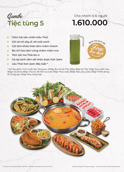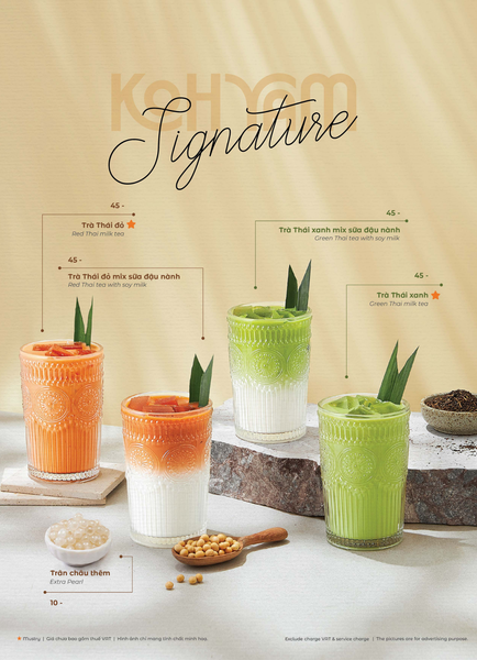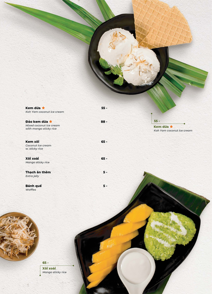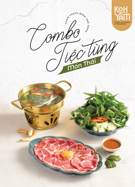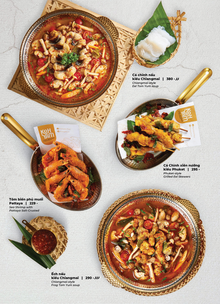 Menu tại Koh Yam đa dạng với những món đặc trưng mang đậm dấu ấn ẩm thực Thái. Nổi bật nhất phải kể đến lẩu Thái và súp Tom Yum – hai món “quốc dân” có vị chua cay đậm đà, thơm lừng mùi sả và lá chanh. Các món gỏi xoài xanh cá trê xây tổ, gỏi tôm khỏa thân tắm mắm chanh, hay gà lạnh tắm sốt thảo dược mang đến sự kết hợp độc đáo giữa độ giòn – chua – cay đầy kích thích vị giác. Thực khách yêu thích đồ nướng nhất định không thể bỏ qua heo dằm nướng tảng, mực nướng tảng sốt Thái hay bò Fuji kiểu Thái, được tẩm ướp vừa vặn, thơm nức và vô cùng bắt vị. Kết thúc bữa ăn với kem dừa Koh Samui hoặc xôi xoài Thái, bạn sẽ cảm nhận được trọn vẹn hương vị đặc trưng chuẩn Thái của nhà hàng.