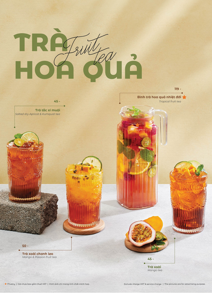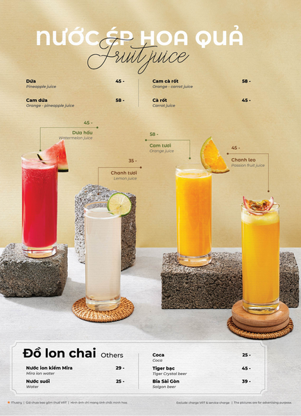 Giá menu chưa bao gồm VAT. Đối với đồ ăn/ đồ uống không cồn nhà hàng thu VAT là 08%. Với đồ uống có cồn nhà hàng thu VAT là 10%