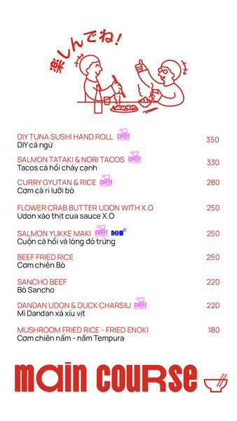 Nhắc đến FEN Izakaya, thực khách khó lòng bỏ qua những món ăn tinh hoa được chế biến khéo léo theo phong cách Nhật. Các món nổi bật phải kể đến như nghêu hấp miso thơm lừng, vị ngọt thanh của nghêu quyện trong hương miso đậm đà. Thực đơn sashimi đa dạng với phần sashimi 5 món tươi ngon, được tuyển chọn từ hải sản cao cấp, chắc chắn làm hài lòng những tín đồ yêu thích ẩm thực Nhật Bản. Ngoài ra, nhà hàng còn có salad trái cây thanh mát giúp cân bằng vị giác, món mì Dan Dan kiểu Hoa độc đáo mang đến sự mới lạ trong khẩu vị, và salmon Yukke Maki – sự kết hợp tinh tế giữa cá hồi và gia vị chuẩn Nhật. Từng món ăn đều được trình bày đẹp mắt, hương vị hài hòa, vừa đậm chất truyền thống vừa mang hơi thở hiện đại.
