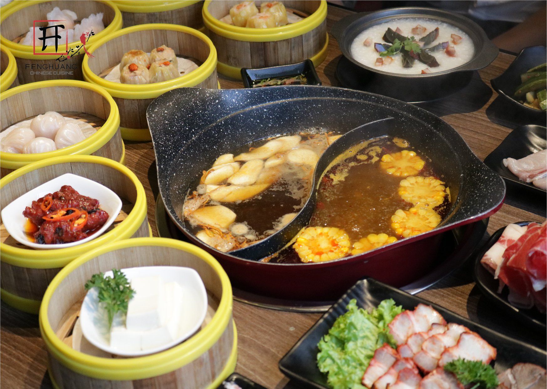 Các món ăn tại đây được trình bày cầu kỳ, đẹp mắt, mỗi món là một hương vị khác biệt khó trộn lẫn. Bạn sẽ thỏa thích lựa chọn thực đơn đến gần 60 món ăn hấp dẫn, trong đó Dimsum và Lẩu là 2 món ăn “đắt khách” nhất mà bạn không nên bỏ lỡ. Ngoài ra, Fenghuang còn nổi tiếng với các món ăn đậm đà hương vị như: Bắp bò cay thơm Hồng Kông, bánh bao Kim Sa, Xíu mại gà chiên giòn, nem tam sắc, há cảo Triều Châu, há cảo Tứ Xuyên, Cháo trứng bắc thảo thịt muối, lẩu bò Hồng Kông, Lẩu Tứ xuyên, Ba chỉ bò mỹ, Tôm sú, Xiao long bao… hay há cảo tôm thanh ngọt hấp dẫn. Để có thể đáp ứng mọi nhu cầu và làm cho lựa chọn của thực khách thêm phần phong phú, Fenghuang chế biến mỗi món theo rất nhiều cách: hấp-xào-chiên-rán.