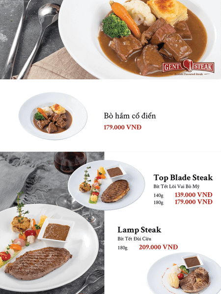 Đối với những thực khách đã nhiều lần ghé thăm GENT chắc chắn chẳng thể bỏ qua một trong số những món steak hấp dẫn của nhà hàng như: Top Blade Steak, Lamb Steak, T-Bone Steak, Fuji Steak… Thưởng thức những miếng bít tết thấm đẫm hương vị châu Âu với phần thịt mềm mại, thơm ngon chắc chắn sẽ đem đến cho thực khách những trải nghiệm khó quên. Tuy nhiên đi kèm với steak thì làm sao có thể thiếu các loại sốt giúp gia tăng hương vị. Thấu hiểu điều này, Nhà hàng GENT cũng phục vụ những loại sốt bít tết thơm ngon: Sốt cam cay, Sốt vang đỏ, Sốt nấm, Sốt tiêu đen…