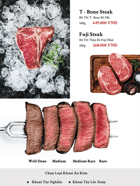 * Món đặc sắc: Top Blade Steak, Lamb Steak, T-Bone Steak, Fuji Steak…