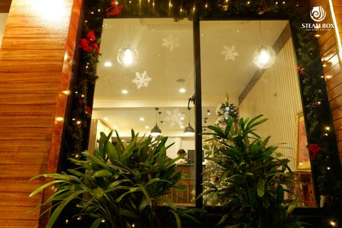 Sở hữu không gian 4 tầng rộng lớn cùng sức chứa 300 khách, Steam Box không chỉ được lòng thực khách bởi những món ăn ngon, mà còn tạo thiện cảm bởi không gian hiện đại nhưng vô cùng gần gũi và ấm cúng. Một không gian lịch sự, nhã nhặn, đặc trưng với những gam màu trầm: gam nâu mộc mạc từ những ghế gỗ đệm da, gam đen của khung cửa cùng chút sắc vàng hiền hòa từ những chiếc đèn thả trần...