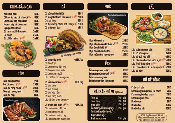 * Món đặc sắc: Combo, các món nướng, cá lăng/ chình/tầm tươi chế biến các món, Lẩu