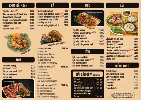 * Món đặc sắc: Combo, các món nướng, cá lăng/ chình/tầm tươi chế biến các món, Lẩu