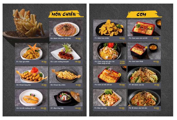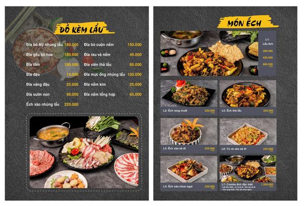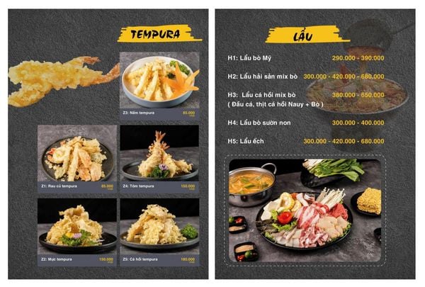 * Món đặc sắc: Sashimi, sushi, salad, lẩu ếch, lẩu Hải sản mix bò, mì ếch, bún Hải sản, ếch rang muối,..