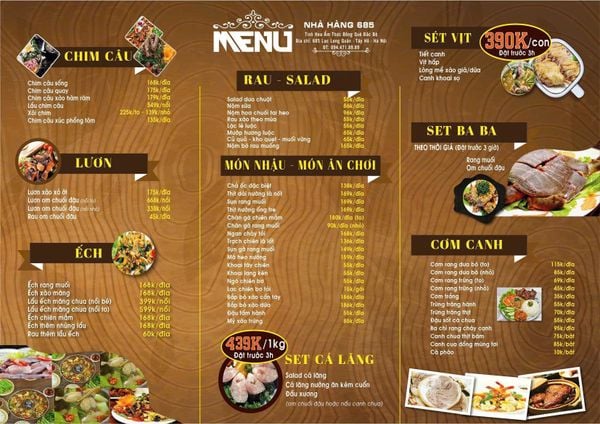 Lẩu Cua Đồng 685 là sự kết hợp đặc biệt khéo léo của nước lẩu ngọt thanh và phần riêu cua đồng thơm bùi không thể chối từ. Cũng chính nhờ hương vị hấp dẫn rất riêng của Lẩu Cua Đồng 685, thực khách chắc chắn sẽ hoàn toàn bị chinh phục bởi những nồi lẩu của nhà hàng. Bên cạnh đó, nhà hàng còn phục vụ những mẹt gà với đa dạng các món gà: Gà chiên mắm, Gà quay, Cổ gà nhồi thịt… Thưởng thức những mẹt gà hảo hạng cùng những phần cơm canh nóng hổi, đậm đà hương vị đồng quê thì còn gì bằng.