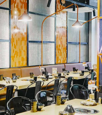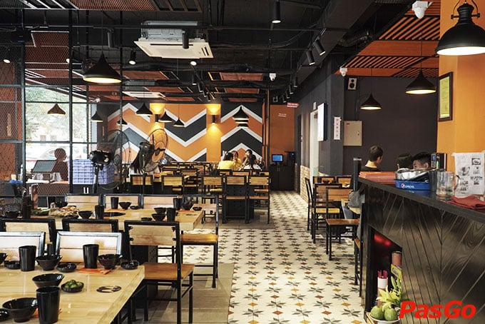 Bước chân vào nhà hàng, thực khách không khỏi choáng ngợp với không gian hiện đại mang hơi thở tươi sáng, trẻ trung nhưng không kém phần gần gũi, ấm cúng với gam màu cam - đen chủ đạo. Đặc biệt, cơ sở 7 Đào Duy Anh còn có cả vị trí ngồi ngoài trời vô cùng rộng rãi, thoáng mát. Đội ngũ nhân viên nhanh nhẹn, nhiệt tình, sẵn sàng hỗ trợ cũng là một điểm cộng lớn của nhà hàng này.