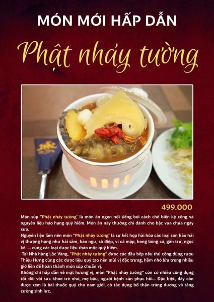 Thực đơn tại Lộc Vàng là sự hòa quyện giữa hương vị Việt Nam đặc sắc và kỹ thuật chế biến công phu. Nổi bật nhất là Bò một nắng trứng muối kiến – món ăn mang hương vị độc đáo, béo ngậy và đậm đà, khiến thực khách khó quên. Bên cạnh đó, món Phật nhảy tường – biểu tượng của ẩm thực cung đình, hay Gà H’Mông tiềm thảo mộc bổ dưỡng, thơm phức cũng là những món “đinh” khiến bất kỳ ai đến quán đều muốn thưởng thức. Mỗi món ăn đều thể hiện rõ sự tinh tế trong cách nêm nếm và trình bày, đúng chất của một nhà hàng cao cấp.