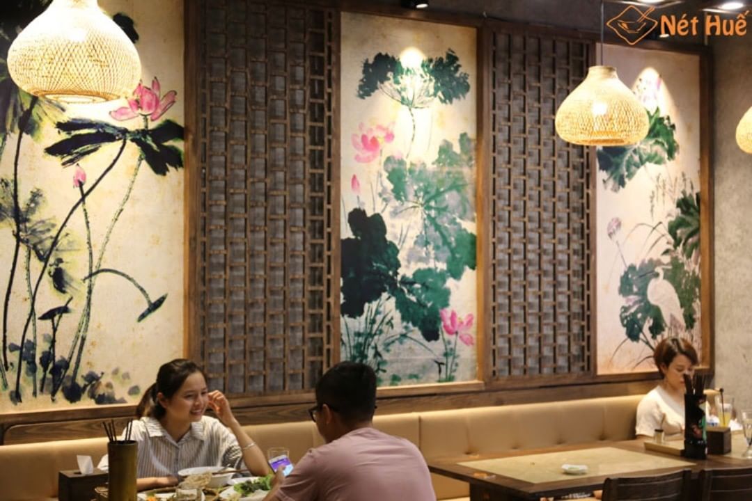 Mang phong cách thiết kế quen thuộc của cả chuỗi nhà hàng, Nét Huế tọa lạc trên con đường Mai Hắc Đế nhộn nhịp cũng đem đến cho thực khách một không gian ấm cúng, mộc mạc đậm chất Huế xưa. Từ thiết kế nội thất, sắp xếp bàn ghế, đèn trần đến phong cách trang trí, bày biện… đều toát lên một vẻ đẹp bình dị, hài hòa mà cực kỳ nhẹ nhàng, dễ dàng khiến bạn cảm thấy như đang dùng bữa tại chính xứ cố đô vậy.