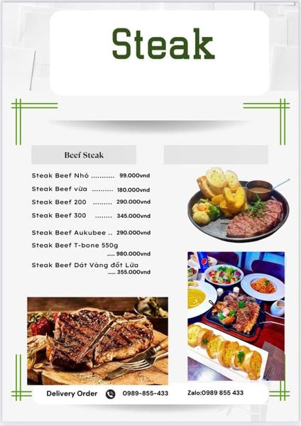 * Món ăn đặc sắc: Mỳ ý sốt bò băm, bò bản vai sốt, Beef Ribeye nướng bản đá, Steak T Bone, Bò lõi vai nướng bản đá, Hải sản bỏ lò kiểu Pháp, Salad hoàng đế cá hồi,...