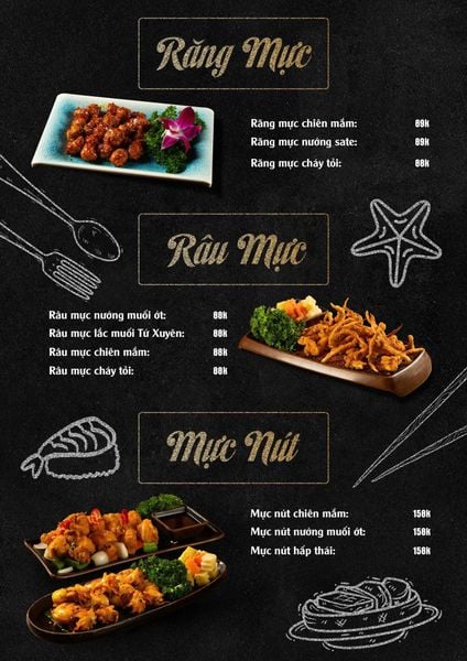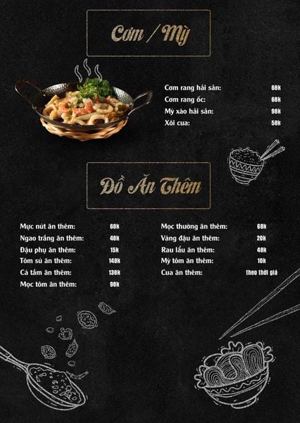 * Món đặc sắc: Bò thiết bản sốt tiêu đen ăn kèm cơm cháy, Ngan cháy tỏi, Tôm sú nướng muối ớt, Tôm tắm sốt Thái, Tràng heo cháy tỏi, Lẩu bò tứ quý, Lẩu chim câu…