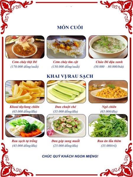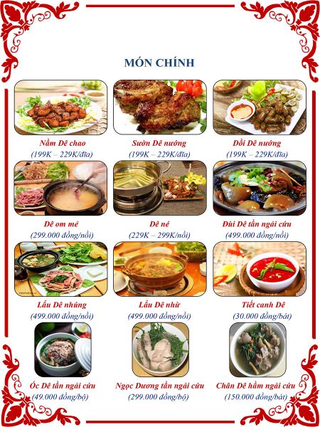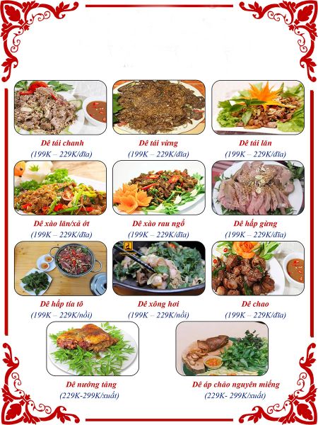 * Món đặc sắc: Dê nướng tảng, Dê tái chanh, Nầm dê chao, Dồi dê nướng,…