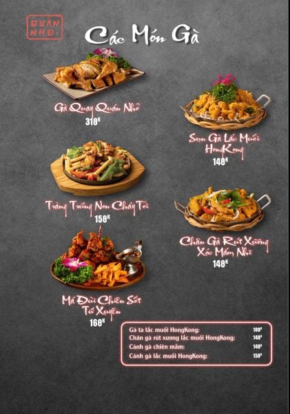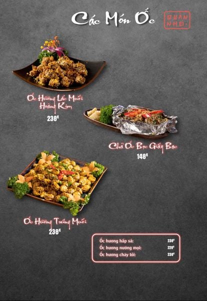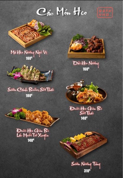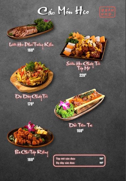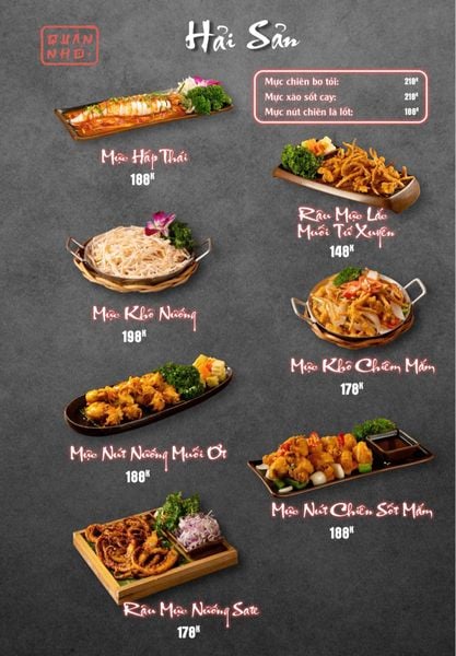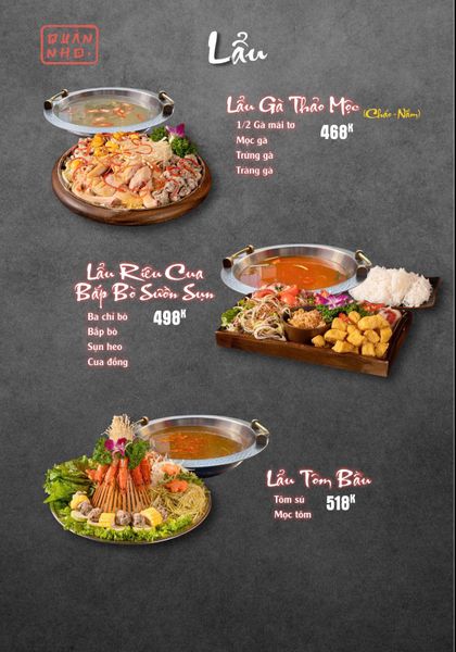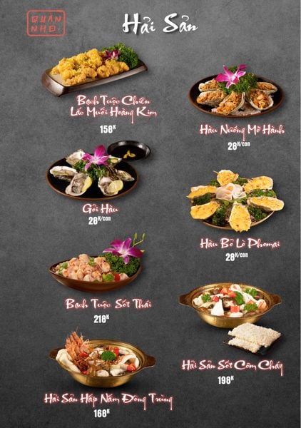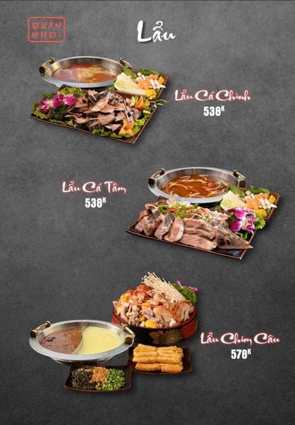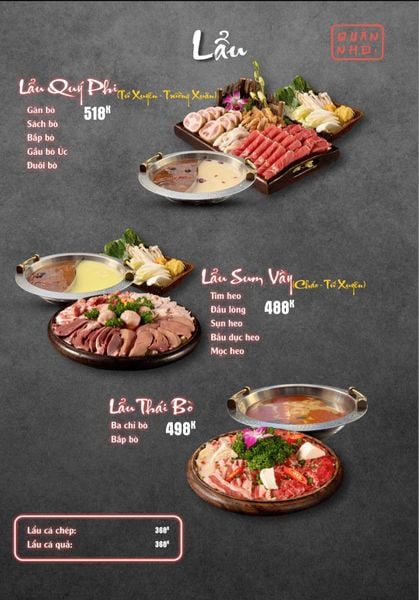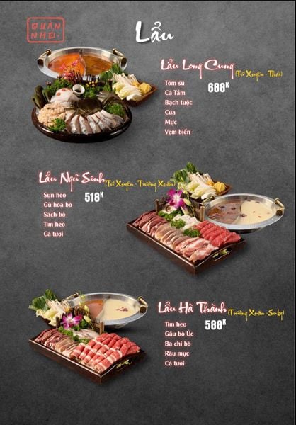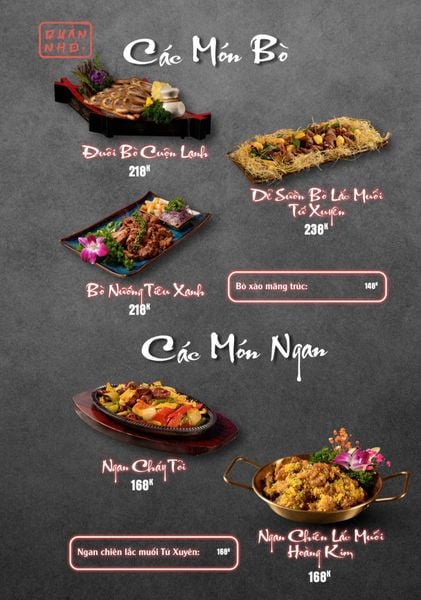 * Món đặc sắc: Bò thiết bản sốt tiêu đen ăn kèm cơm cháy, Ngan cháy tỏi, Tôm sú nướng muối ớt, Tôm tắm sốt Thái, Tràng heo cháy tỏi, Lẩu bò tứ quý, Lẩu chim câu…