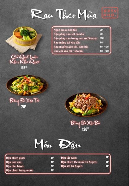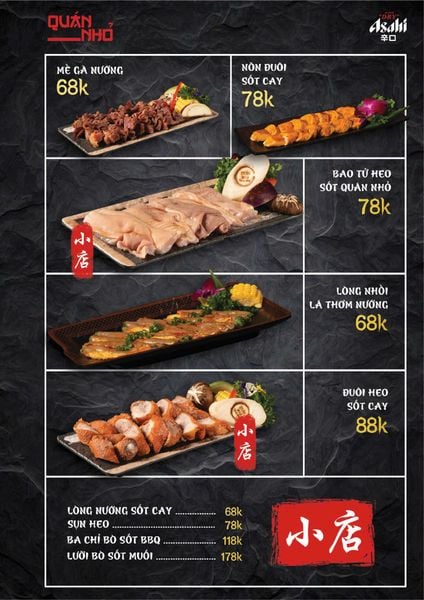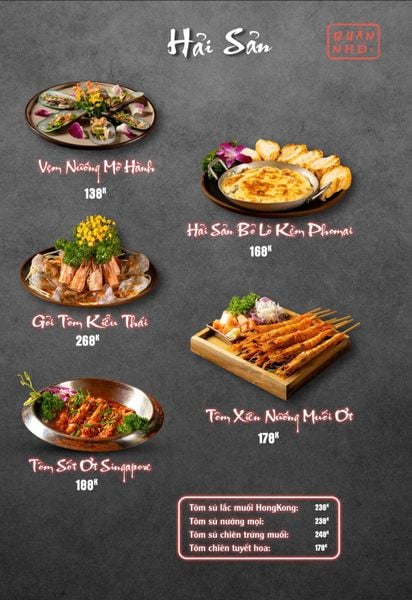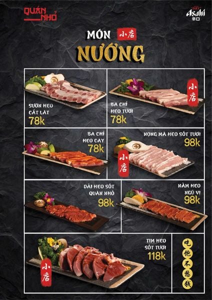 Thực đơn của Quán Nhỏ Vĩnh Tuy khiến bất cứ ai cũng phải ấn tượng bởi sự đa dạng và phong phú. Mỗi món ăn ở đây đều được chế biến cầu kỳ, giữ trọn vị ngon tự nhiên của nguyên liệu. Một số món nổi bật có thể kể đến như Bò thiết bản sốt tiêu đen ăn kèm cơm cháy – hương vị thơm nức, cay nhẹ và giòn rụm; Ngan cháy tỏi đậm vị, hấp dẫn ngay từ miếng đầu tiên; hay Tôm sú nướng muối ớt, Tôm tắm sốt Thái mang hơi hướng ẩm thực Á Đông hiện đại. Ngoài ra, những món ăn dân dã như Tràng heo cháy tỏi, Lẩu bò tứ quý, Lẩu chim câu cũng được lòng thực khách nhờ hương vị đặc trưng, vừa ngon vừa ấm bụng.