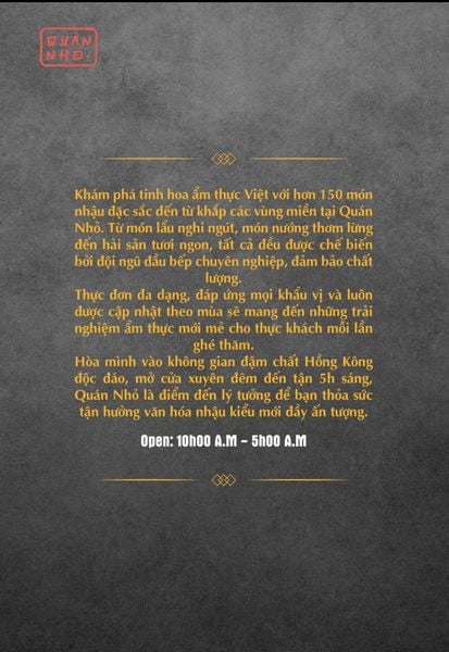 Giữa lòng Hà Nội nhộn nhịp, Quán Nhỏ - 122 Vĩnh Tuy, Phường Vĩnh Phú, Quận Hai Bà Trưng là một góc ẩm thực quen thuộc của những ai yêu thích món Việt đậm đà, được chế biến tinh tế và phục vụ trong không gian ấm cúng, gần gũi. Không cầu kỳ hay xa hoa, Quán Nhỏ mang đến cảm giác thân thuộc như một “bếp nhà” đúng nghĩa, nơi thực khách có thể tận hưởng trọn vẹn hương vị truyền thống trong từng món ăn.