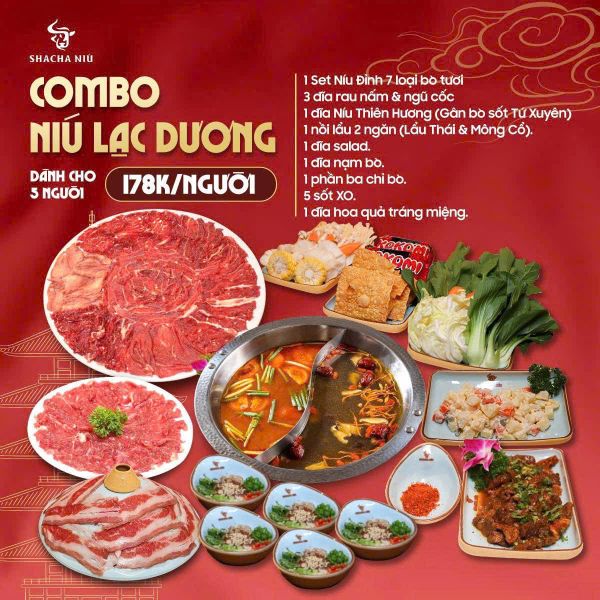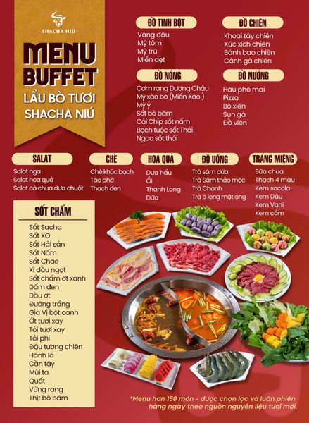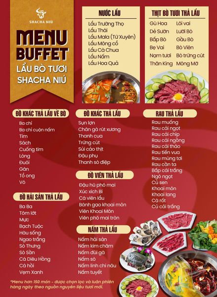 SHACHA NIÚ tự hào là một trong những nhà hàng chuyên về các món thịt bò tươi hàng đầu tại Hà Nội, với công thức chế biến độc đáo và nguồn nguyên liệu được tuyển chọn kỹ lưỡng. Tên gọi "SHACHA NIÚ" (Niú theo Hán Việt có nghĩa là bò) đã phần nào khẳng định sự chuyên sâu của nhà hàng vào loại nguyên liệu cao cấp này. Thực đơn tại đây vô cùng phong phú, từ các món nướng thơm lừng, lẩu bò đậm đà, đến những món xào hấp dẫn. Bên cạnh các món bò làm nên thương hiệu, nhà hàng còn phục vụ nhiều món ăn đặc sắc khác. Nhà hàng phục vụ món đặc sắc như BABA tươi nhúng lẩu, ngoài ra có thể chế biến thành nhiều món ngon như baba rang muối, baba om chuối đậu, baba tiềm nếu khách hàng có nhu cầu và đặt trước món, mang đến hương vị độc đáo và bổ dưỡng. Ngoài ra, thực đơn còn có sự góp mặt của hải sản tươi ngon, từ tôm, cua, mực đến các loại ốc, được chế biến đa dạng, đáp ứng mọi khẩu vị của thực khách. Sự kết hợp giữa những món bò trứ danh và các món ăn truyền thống khác đã tạo nên một thực đơn đa dạng, đầy lôi cuốn, làm hài lòng cả những thực khách khó tính nhất.