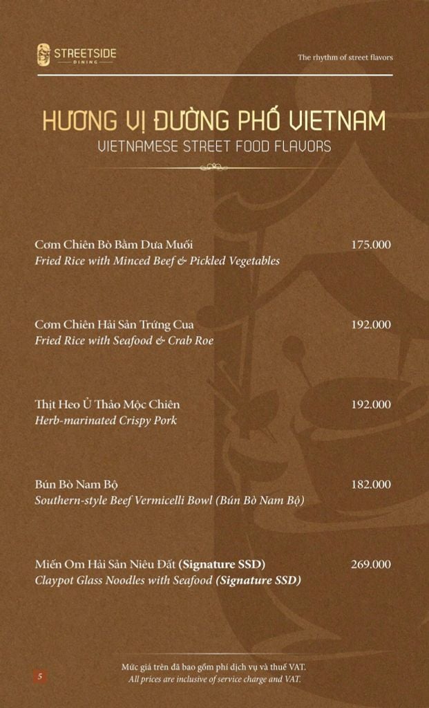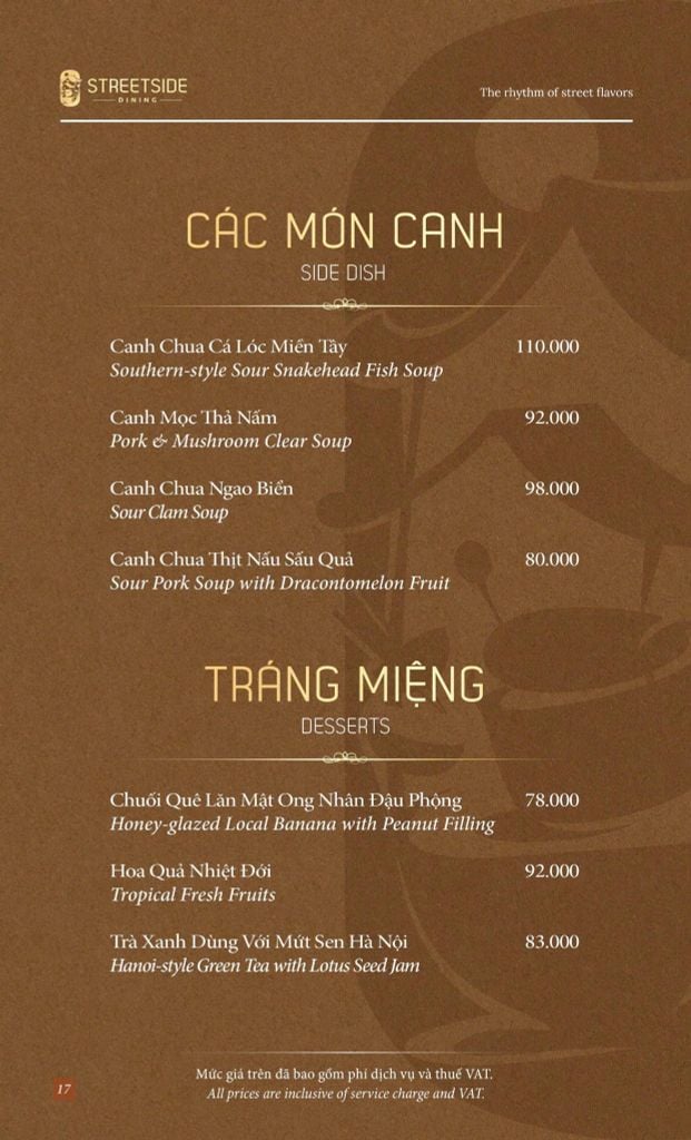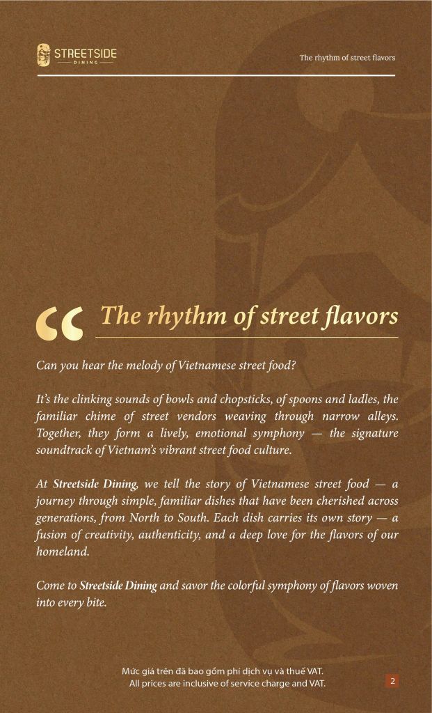 Tọa lạc tại 25 Hàng Gà, ngay trung tâm khu phố cổ Hà Nội, Streetside Dining là điểm hẹn lý tưởng cho những ai muốn trải nghiệm ẩm thực Việt Nam trong một không gian vừa mộc mạc vừa tinh tế. Nhà hàng mang phong cách “street style” hiện đại, kết hợp giữa sự phóng khoáng của đường phố và sự chỉn chu trong từng chi tiết decor, tạo cảm giác vừa thân quen vừa mới mẻ. Đây là nơi hoàn hảo để cùng bạn bè thưởng thức bữa tối thư giãn giữa không gian đậm chất Hà thành.