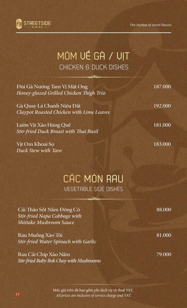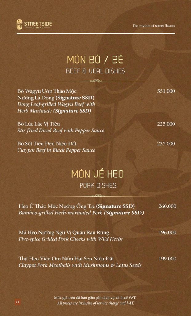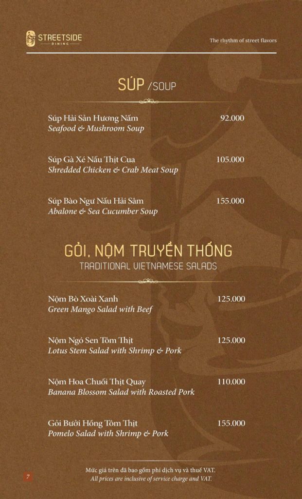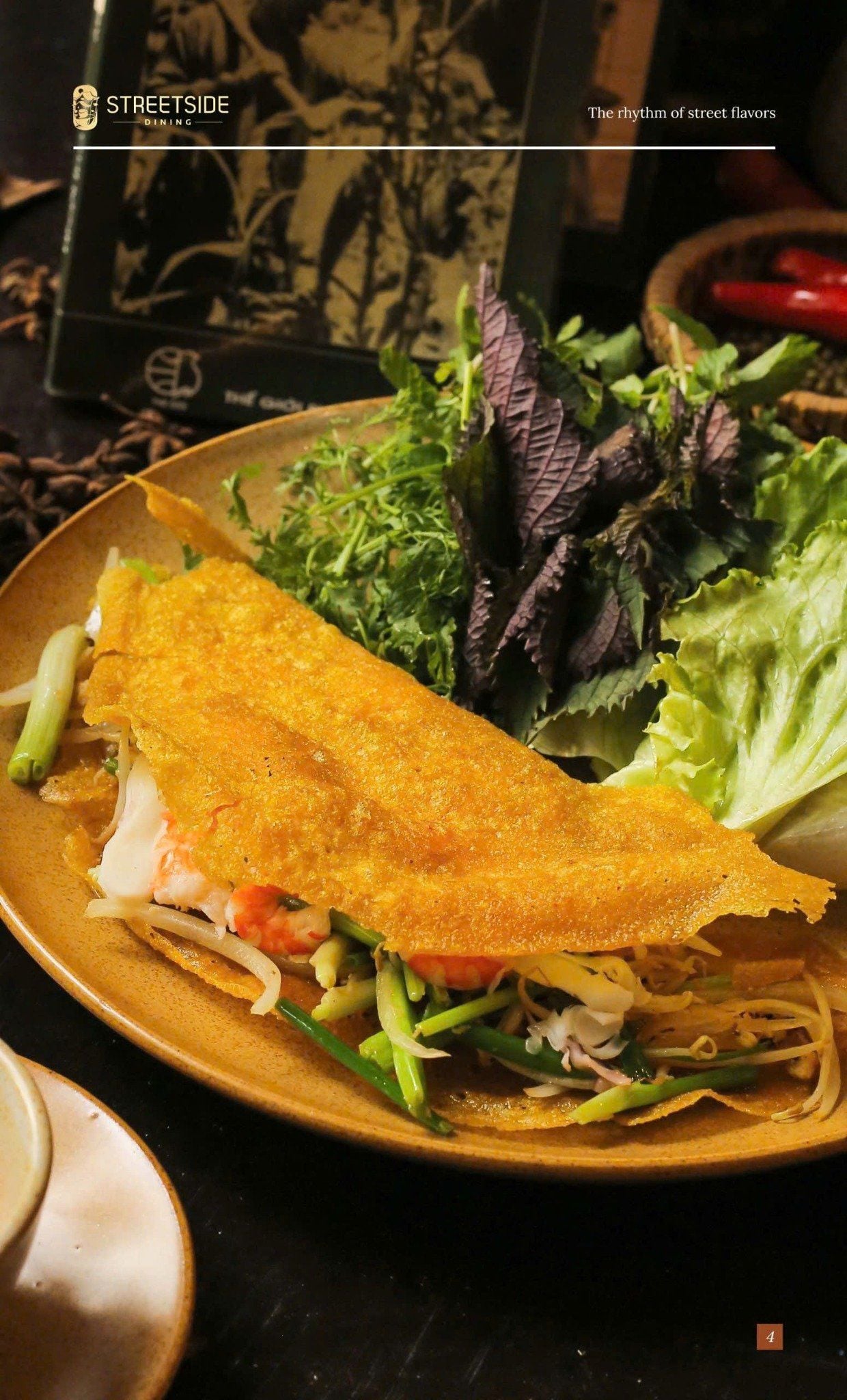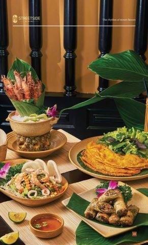 Thực đơn tại Streetside Dining Hàng Gà là sự hòa quyện tinh tế giữa ẩm thực truyền thống Việt và phong cách hiện đại. Những món ăn đặc trưng như Bò Wagyu ướp thảo mộc mềm ngọt, thơm lừng; Heo ủ thảo mộc nướng ống tre mang hương vị núi rừng; hay Đùi gà nướng tam vị mật ong béo ngậy, đậm đà đều khiến thực khách mê mẩn. Đặc biệt, Bánh xèo nhân hải sản giòn tan, vàng ruộm là lựa chọn hoàn hảo để khép lại một bữa ăn trọn vị. Mỗi món ăn đều được chăm chút kỹ lưỡng, vừa giữ trọn bản sắc Việt, vừa mang hơi thở hiện đại.