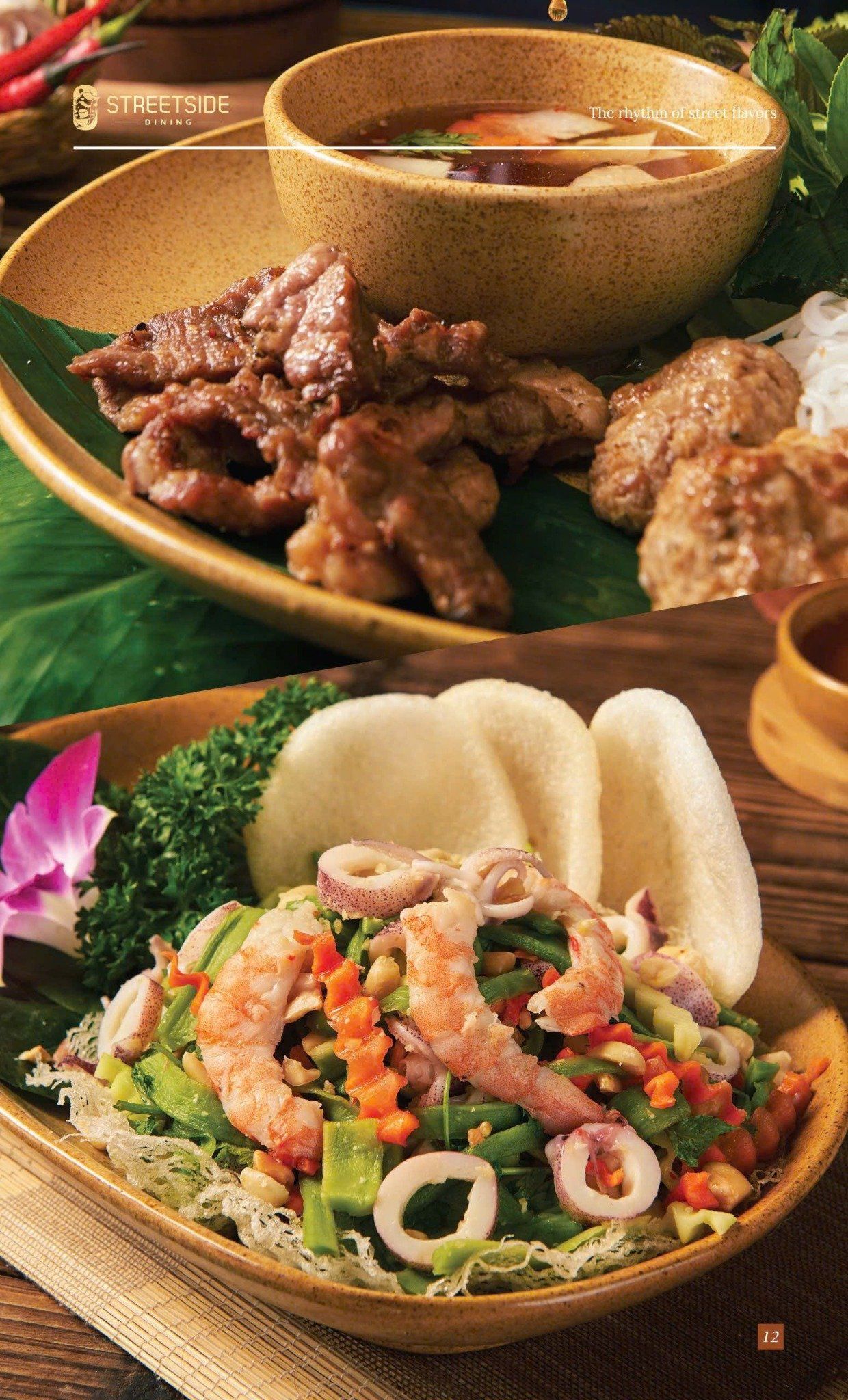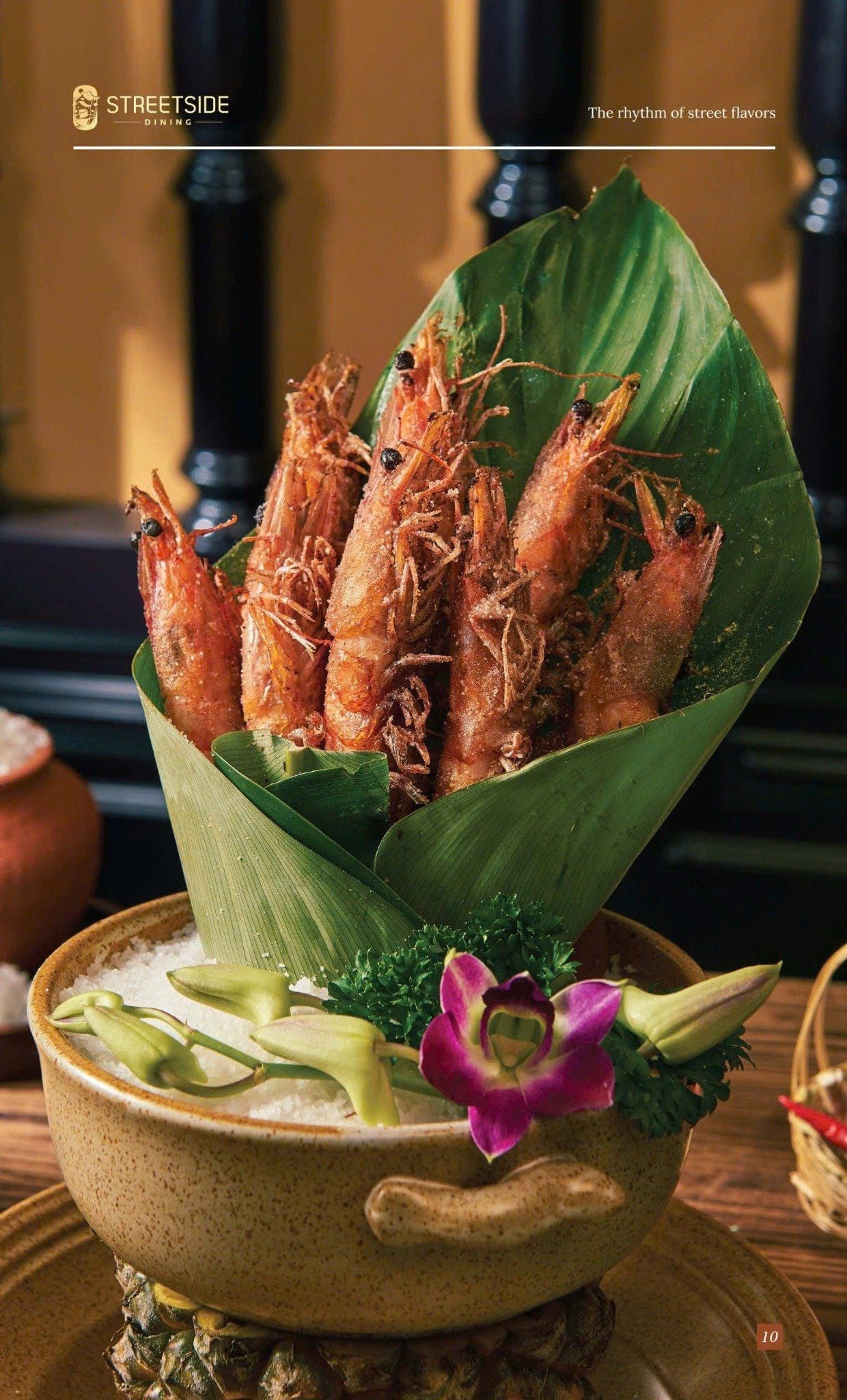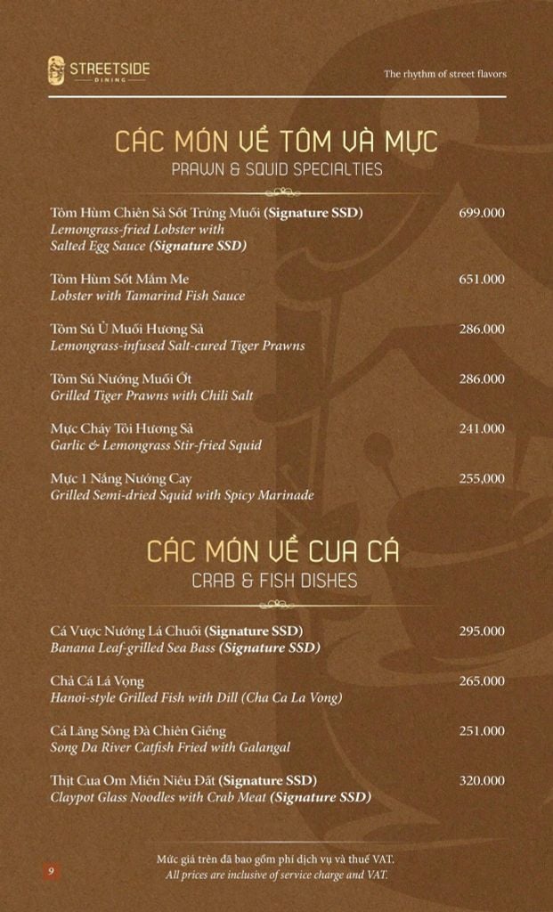 Thực đơn tại Streetside Dining Hàng Gà là sự hòa quyện tinh tế giữa ẩm thực truyền thống Việt và phong cách hiện đại. Những món ăn đặc trưng như Bò Wagyu ướp thảo mộc mềm ngọt, thơm lừng; Heo ủ thảo mộc nướng ống tre mang hương vị núi rừng; hay Đùi gà nướng tam vị mật ong béo ngậy, đậm đà đều khiến thực khách mê mẩn. Đặc biệt, Bánh xèo nhân hải sản giòn tan, vàng ruộm là lựa chọn hoàn hảo để khép lại một bữa ăn trọn vị. Mỗi món ăn đều được chăm chút kỹ lưỡng, vừa giữ trọn bản sắc Việt, vừa mang hơi thở hiện đại.