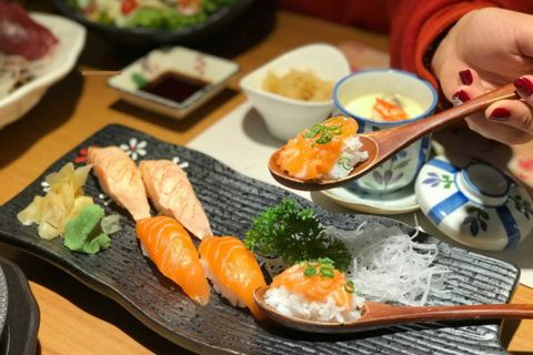 * Món ăn đặc sắc: Cá trích nhồi trứng cá tuyết, Cơm cuộn cá ngừ sốt cay, Sushi tôm ngọt Nhật, Cá tuyết nướng muối,...
