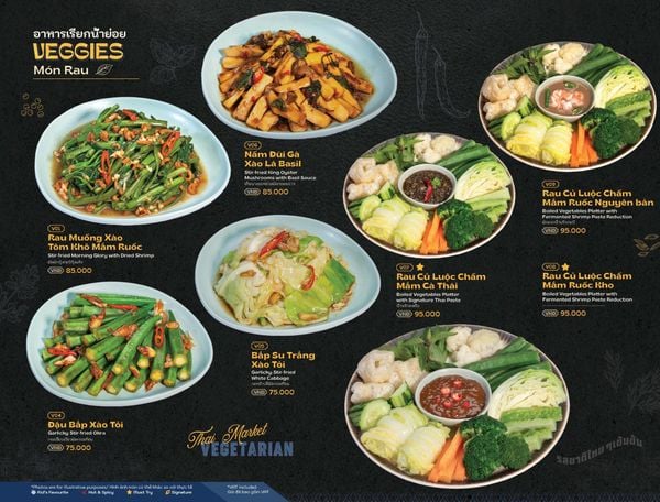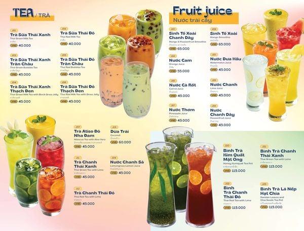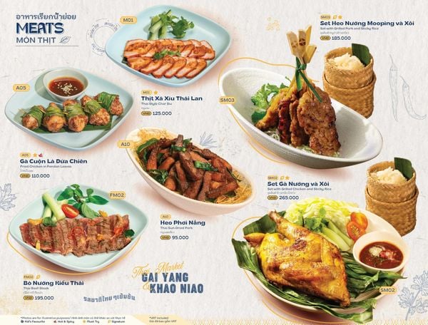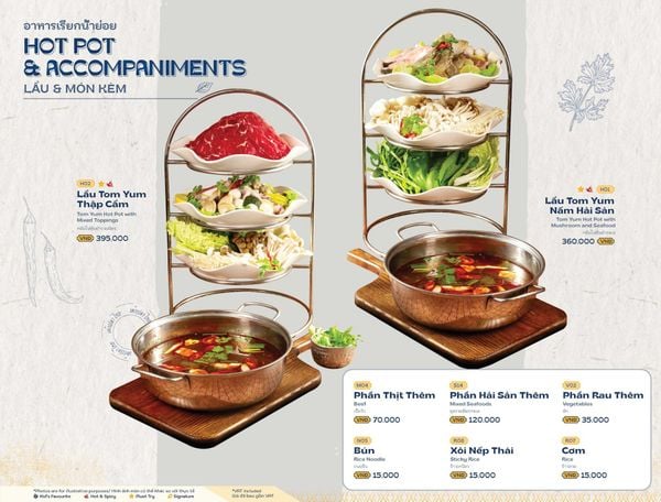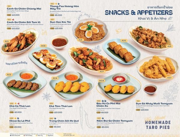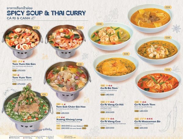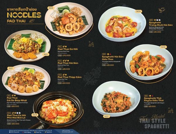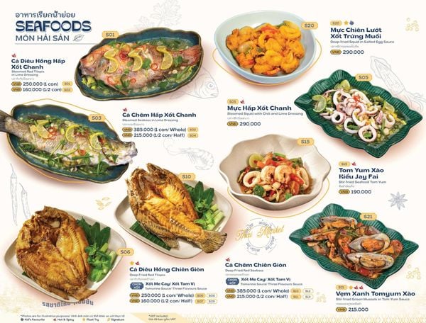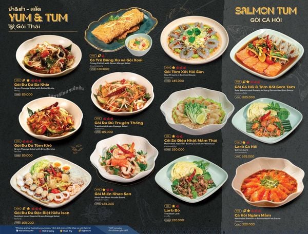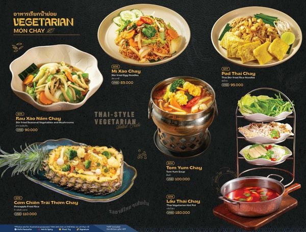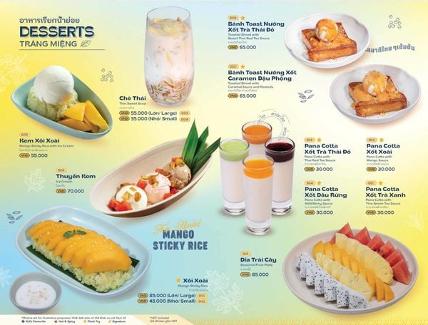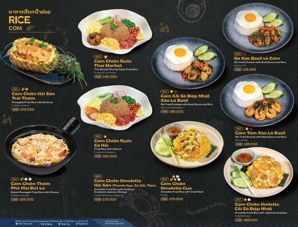 * Món đặc sắc: Gỏi đu đủ Somtam, Xương Khủng Long, Pad Thai, Canh Tomyum, Gỏi miến Khaosan, Cơm chiên trái thơm hải sản, Xôi xoài,...