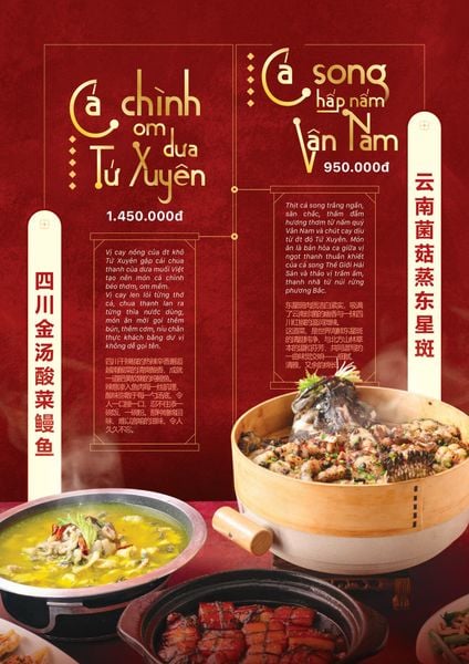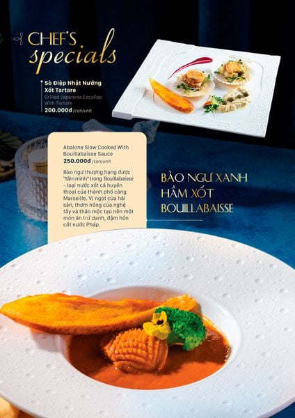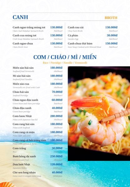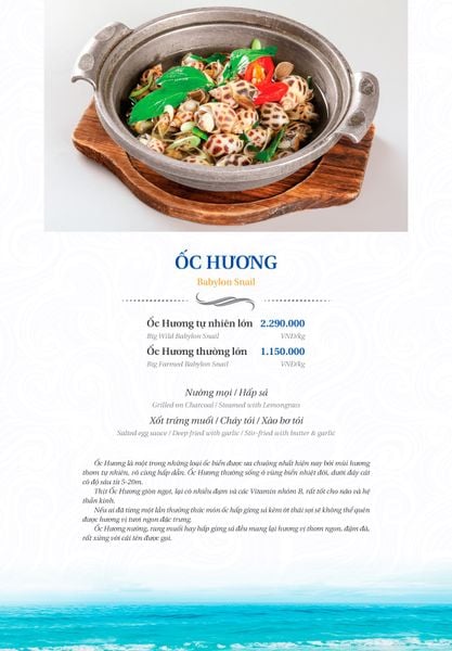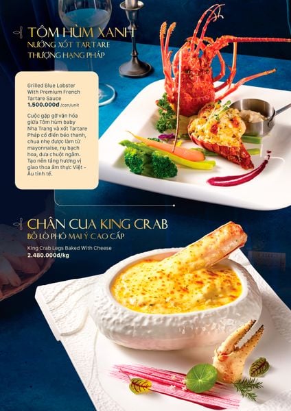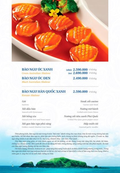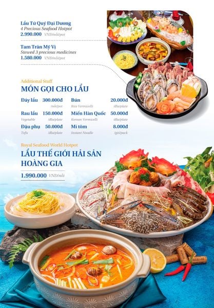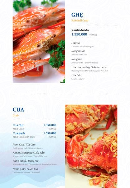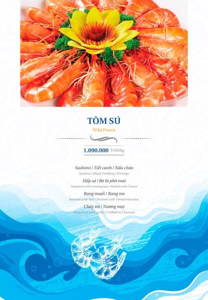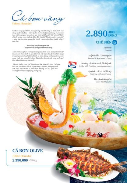 * Món đặc trưng: Lộc biển phát tài ( Tôm hùm bông bỏ lò phomai ), Thuận buồm xuôi gió ( Cá bơn vàng sashimi Hàn Quốc), Báu vật đại dương ( Cua kingcrab hấp rượu vang Pháp), Lẩu thuyền chài....
