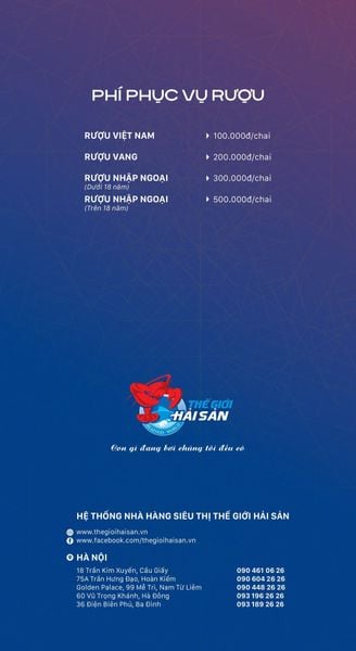 - Quý khách vui lòng không mang đồ ăn vào Nhà hàng. Nhà hàng tính phí khi mang đồ uống từ ngoài vào: Rượu quê 100k/lit, Rượu vang 200k/chai, Rượu mạnh dưới 18 năm 300k/chai, Rượu mạnh trên 18 năm 500k/chai