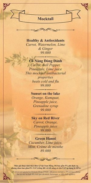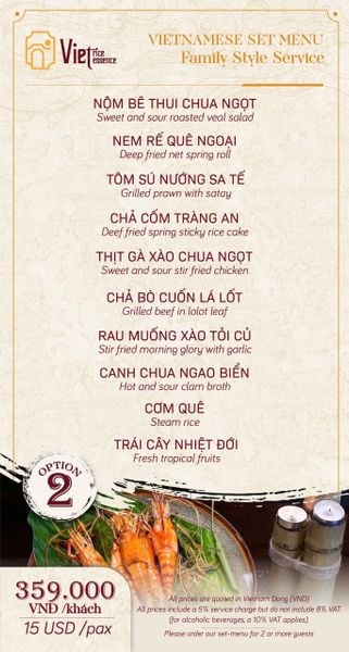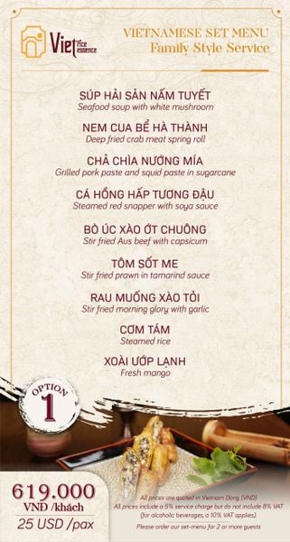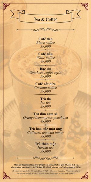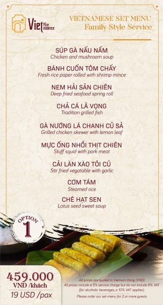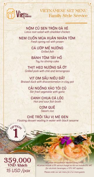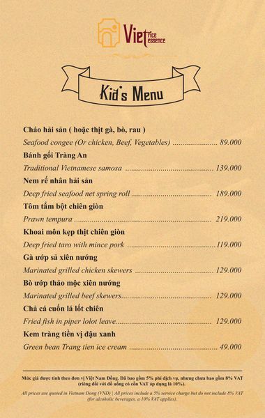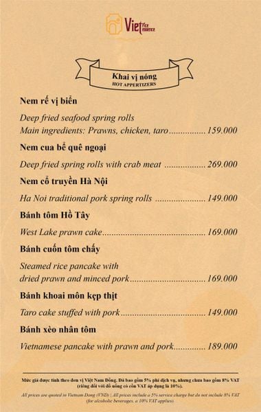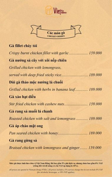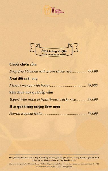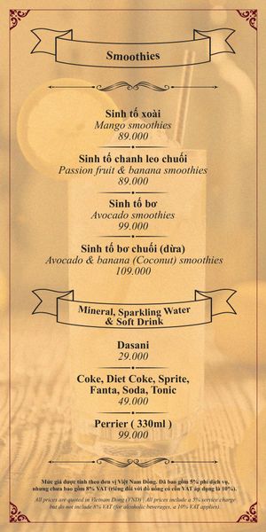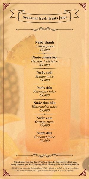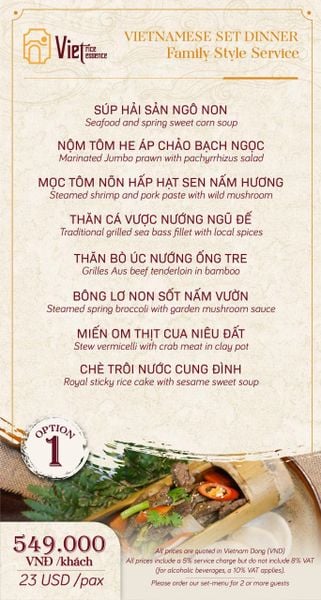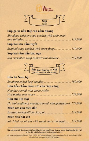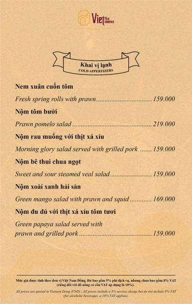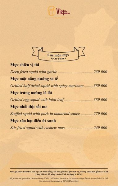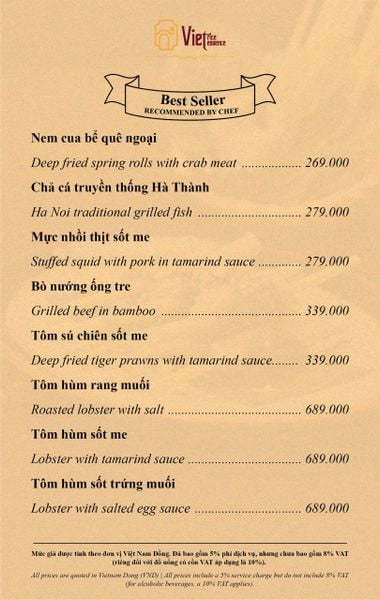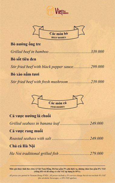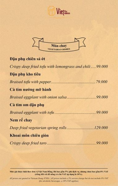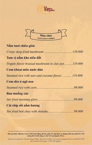 Menu chưa bao gồm VAT, Nhà hàng luôn thu hộ thuế VAT. Mức phí VAT là theo quy định.