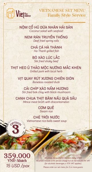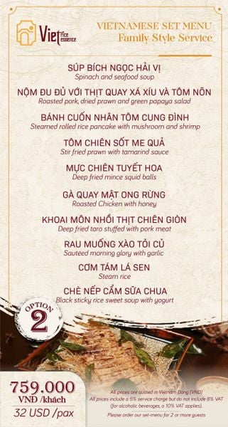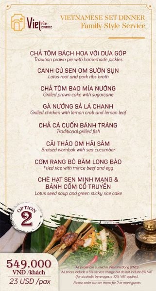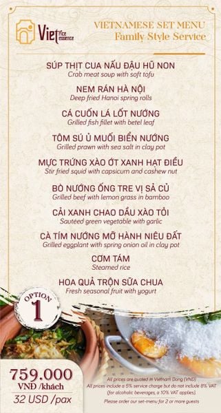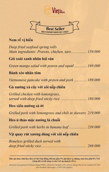 Tại Viet Rice Essence, chất lượng dịch vụ luôn là ưu tiên hàng đầu, cam kết mang đến sự hài lòng tuyệt đối cho mọi thực khách. Đội ngũ nhân viên thân thiện, nhiệt tình, chuyên nghiệp và am hiểu sâu sắc về ẩm thực sẽ luôn sẵn sàng tư vấn, giúp bạn lựa chọn những món ăn phù hợp và phục vụ chu đáo, nhanh chóng. Từ khâu đón tiếp đến việc chăm sóc trong suốt bữa ăn, mọi thứ đều được thực hiện một cách tỉ mỉ, tận tâm, mang lại cảm giác thoải mái và được trân trọng. Với mức giá khoảng 500.000 VNĐ/người, Viet Rice Essence mang đến trải nghiệm ẩm thực chất lượng cao, xứng tầm với hương vị món ăn tinh tế, không gian sang trọng và dịch vụ đẳng cấp. Đây là một khoản đầu tư xứng đáng cho những bữa tiệc trang trọng, những buổi hẹn hò lãng mạn hay khi bạn muốn tự thưởng cho bản thân một hành trình khám phá ẩm thực Việt đầy tinh tế.