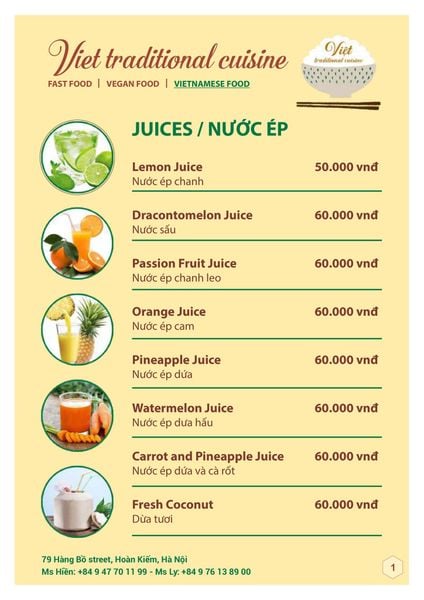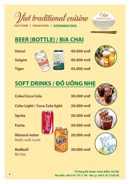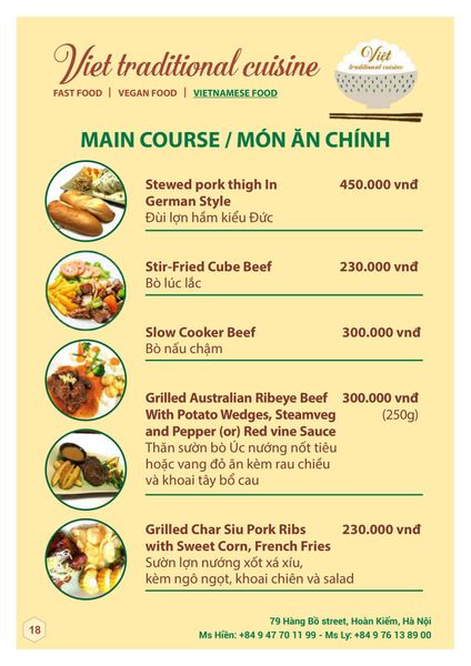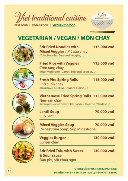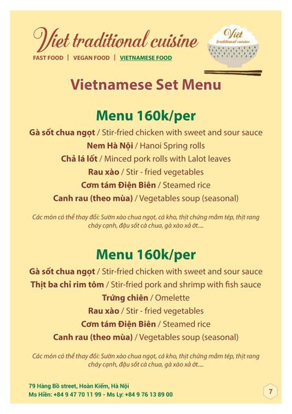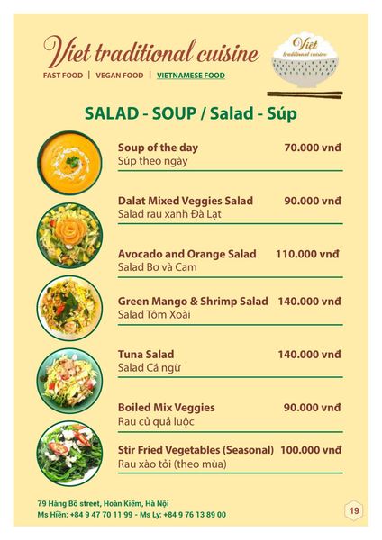 Tọa lạc tại địa chỉ số 79 Hàng Bồ, ngay trên con phố mang đậm dấu ấn lịch sử của Phố Cổ Hà Nội, Nhà hàng Viet Traditional Cuisine hiện lên như một điểm đến quen thuộc và đầy hoài niệm. Nằm giữa khu vực sầm uất, nhộn nhịp, nhà hàng vẫn giữ cho mình một nét trầm mặc, cổ kính, mang đến một không gian riêng tư, ấm cúng và rất đỗi thân thương. Với tên gọi "Viet Traditional Cuisine", nhà hàng đã khẳng định được phong cách và sứ mệnh của mình: gìn giữ và lan tỏa những giá trị ẩm thực truyền thống Việt. Bước chân vào Viet Traditional Cuisine, thực khách sẽ cảm nhận được ngay một bầu không khí thân thiện, gần gũi như đang trở về một ngôi nhà xưa. Nội thất được thiết kế tinh tế với các vật liệu gỗ mộc mạc, cùng cách bài trí đơn giản mà ấm áp, tạo cảm giác thư thái và dễ chịu. Đây là không gian lý tưởng để bạn gác lại những ồn ào của phố thị, cùng nhau thưởng thức bữa cơm truyền thống ngon lành và tận hưởng những khoảnh khắc bình yên, đáng nhớ.