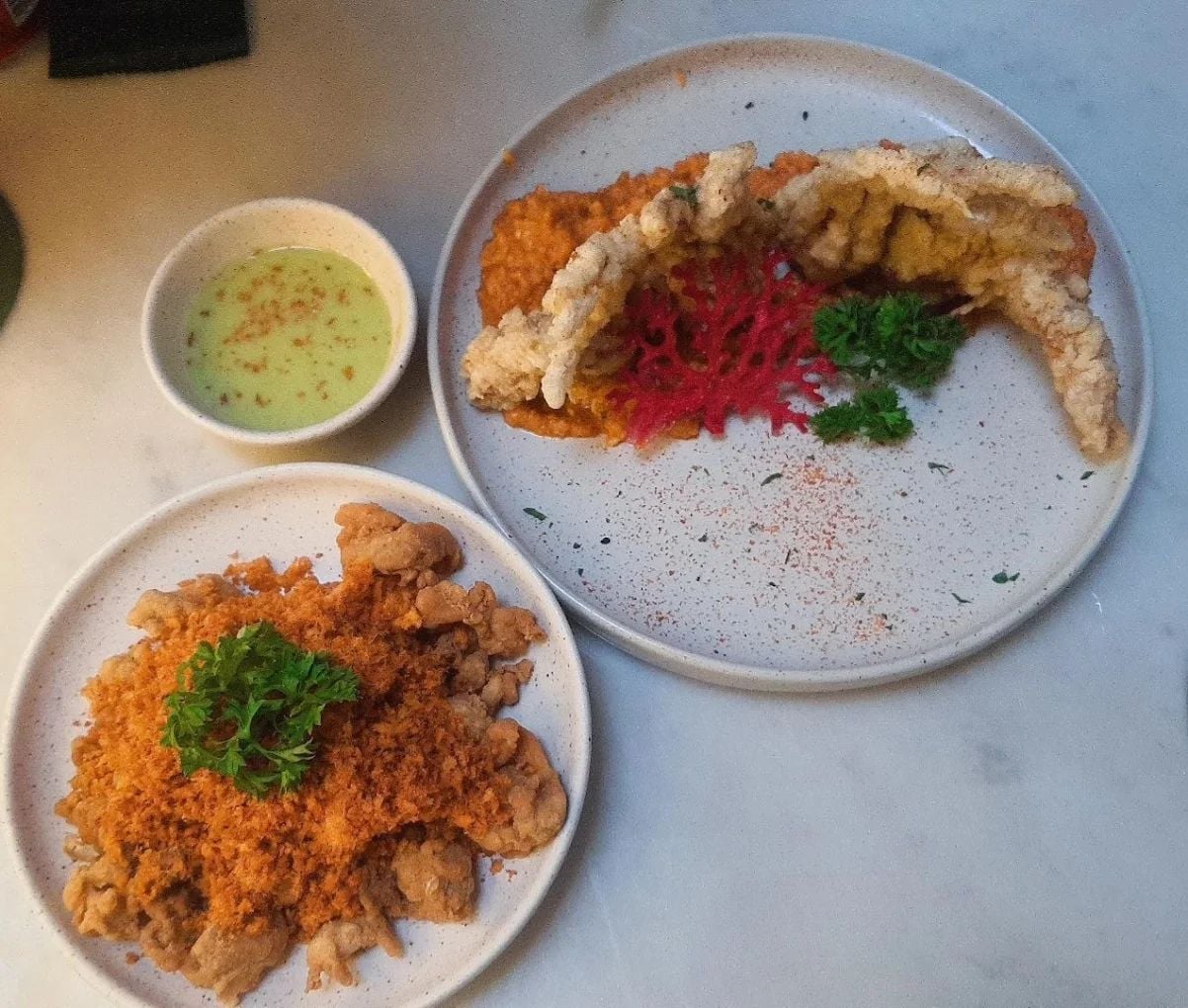 Điểm khiến Zumwhere – Trần Ngọc Diện ghi dấu ấn mạnh mẽ chính là thực đơn mang phong cách fusion sáng tạo, kết hợp linh hoạt giữa ẩm thực Á – Âu. Những món “signature” như da gà chiên giòn sốt miso cay luôn nằm trong danh sách gọi nhiều nhất nhờ lớp da giòn rụm, thấm sốt cay mặn vừa phải, ăn hoài không ngán. Mực sữa nguyên con chiên giòn giữ trọn độ ngọt tự nhiên, lớp vỏ mỏng giòn nhẹ, rất thích hợp để chia sẻ cùng bạn bè. Bên cạnh đó, gà chiên giòn, gỏi hải sản khoai môn hay tôm cuộn ba rọi xông khói mang đến sự cân bằng thú vị giữa độ béo, độ tươi và gia vị được nêm nếm khéo léo. Đặc biệt, cá hồi sống sốt nấm True là món ăn được nhiều thực khách yêu thích bởi hương vị thanh nhẹ, béo dịu, tạo cảm giác mới mẻ nhưng vẫn dễ ăn, phù hợp cho cả những ai lần đầu thử món sống.
