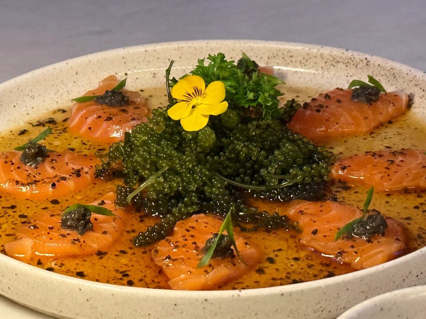 Thực đơn tại Zumwhere tiếp tục ghi dấu ấn với phong cách ẩm thực sáng tạo, mang hơi hướng fusion Á – Âu đầy cuốn hút. Những món “best seller” như da gà chiên giòn sốt miso cay luôn khiến thực khách ấn tượng bởi lớp da giòn rụm, vị cay mặn hài hòa, ăn càng nhiều càng dễ ghiền. Mực sữa nguyên con chiên giòn giữ trọn độ ngọt tự nhiên, lớp vỏ giòn nhẹ, rất thích hợp để chia sẻ cùng bạn bè. Bên cạnh đó, gà chiên giòn, gỏi hải sản khoai môn hay tôm cuộn ba rọi xông khói mang đến sự cân bằng thú vị giữa độ béo, độ tươi và cách nêm nếm vừa miệng. Đặc biệt, cá hồi sống sốt nấm True là lựa chọn được nhiều thực khách yêu thích nhờ hương vị thanh nhẹ, béo dịu và cảm giác mới mẻ, phù hợp với những ai muốn thưởng thức món sống nhưng vẫn dễ ăn.